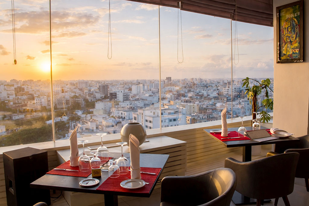 - Situé tout en haut de l’hôtel, le restaurant et lounge « Le 12ème » vous fera vivre une expérience unique dans un univers glamour et élégant. Avec une vue à 360° sur la ville de Sousse, ce restaurant ravira vos papilles d’une cuisine novatrice et raffinée.