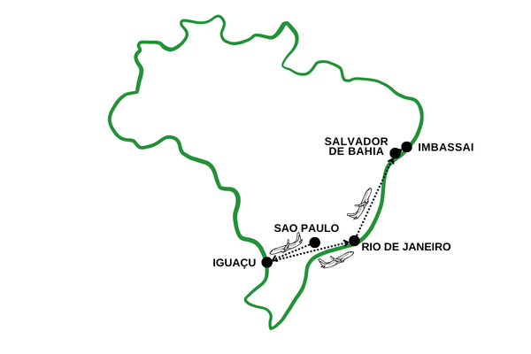 * Le nom de la compagnie aérienne et les horaires sont donnés à titre purement indicatif et vous seront communiqués définitivement à 8 jours du départ. Les compagnies opérant vers le Brésil sont : Air France, KLM, Iberia, Air Portugal, Air Europa ou autres compagnies dont le nom vous sera communiqué à 8 jours du départ.