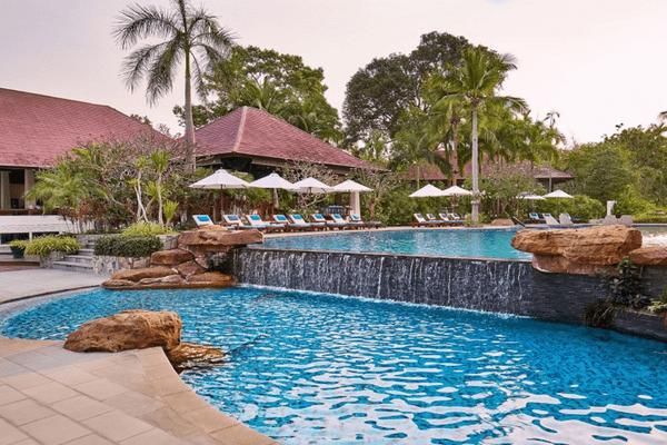 Situé à seulement 30 minutes au sud de Pattaya et à environ 1h30 de l’aéroport international de Suvarnabhumi, l’hôtel se trouve à Na Chom Thian, un quartier calme et verdoyant. Il offre un accès direct à une plage de sable blanc et se trouve à proximité d’attractions telles que le jardin botanique tropical de Nong Nooch, le parc aquatique Ramayana et le sanctuaire de Khao Chi Chan. L’établissement marie élégamment architecture thaïlandaise et influences balinaises, avec des jardins luxuriants, des bassins et des espaces ouverts propices à la détente. L’atmosphère y est sereine et intimiste, idéale pour une escapade romantique ou un séjour familial au calme.