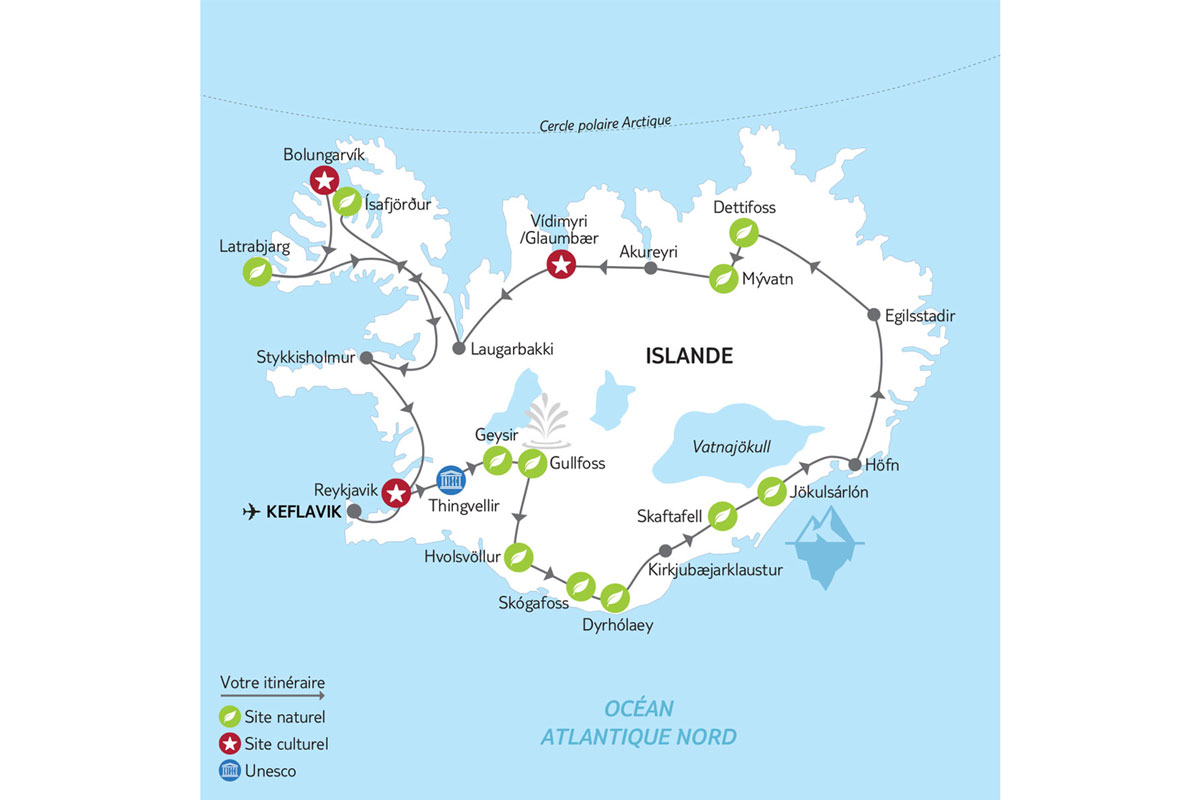 Cet itinéraire complet en Islande vous invite à explorer toutes les facettes de cette île où la glace et le feu semblent s'accorder. Entre geysers, icebergs, champs de lave, cascades, lagons aux eaux laiteuses et chaudes, glaciers... vous serez émerveillé par ces paysages et cette faune uniques, dont ceux des fjords de l'Ouest encore sauvages et peu connus.