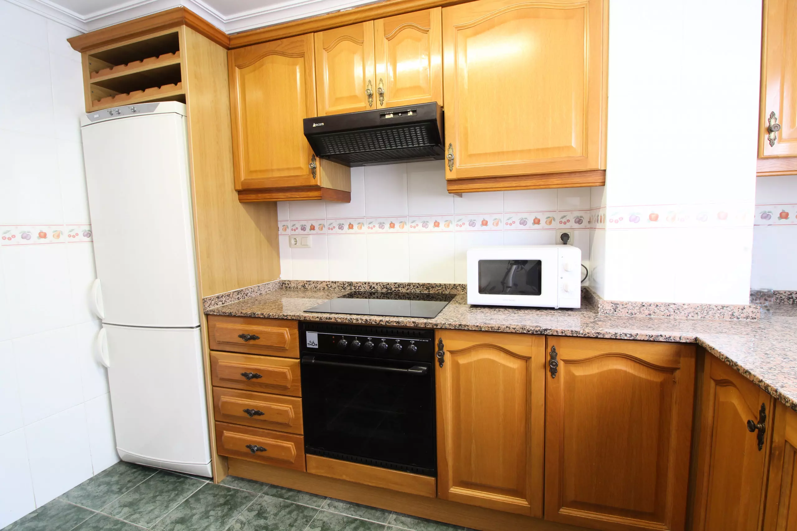 La cuisine indépendante, à vitrocéramique, est équipée avec réfrigérateur, micro-ondes, four, congélateur, vaisselle/couverts, ustensiles/cuisine, cafetière, grille pain et presse-agrumes.