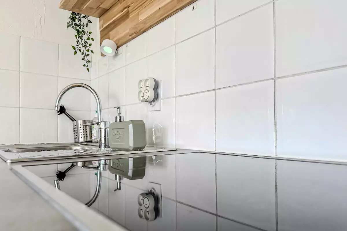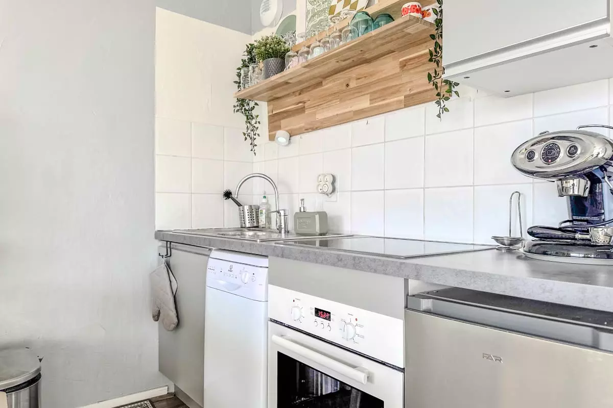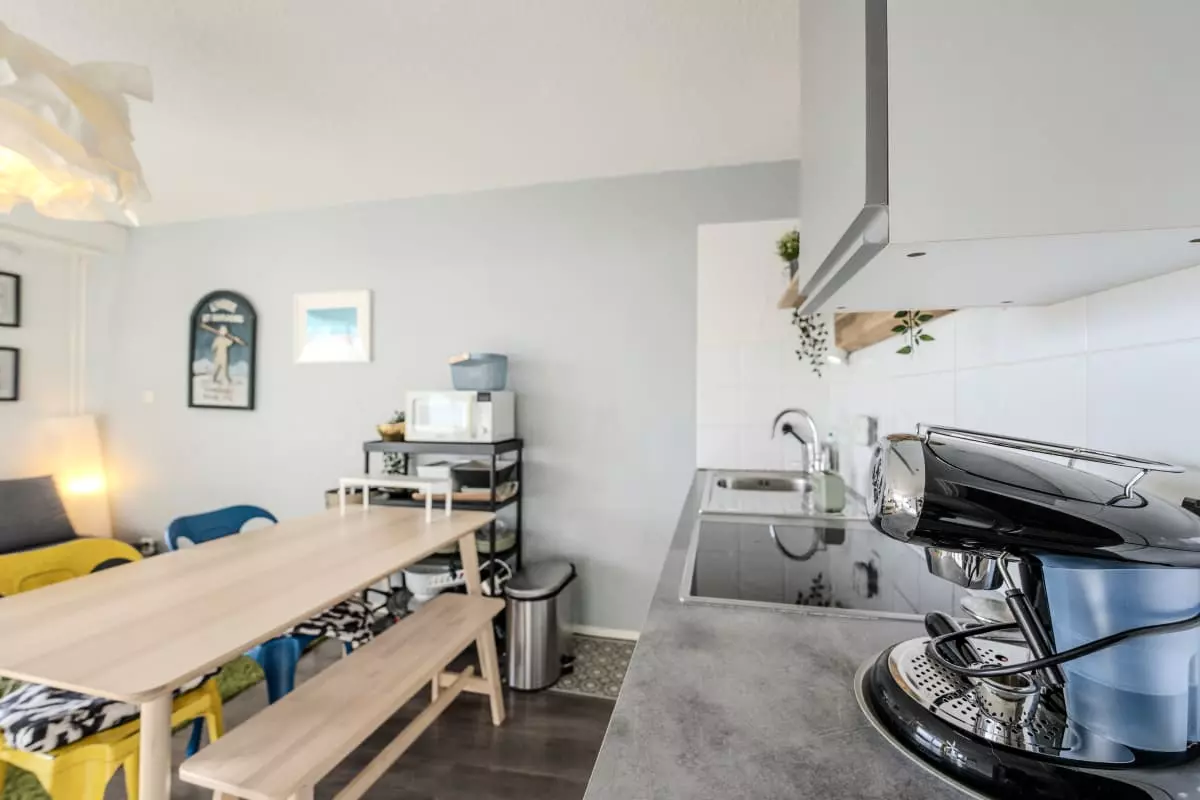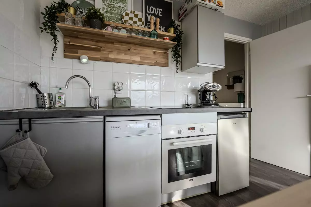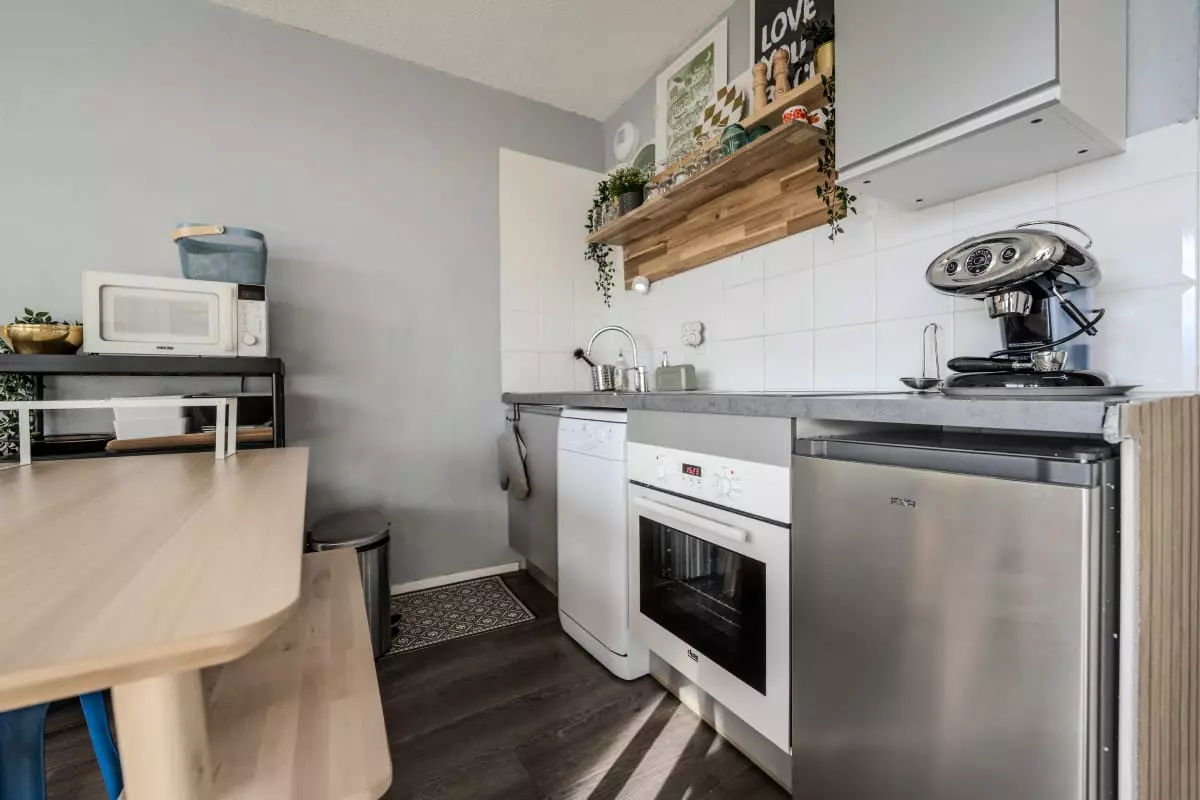 - d'une cuisine ouverte parfaitement équipée (plaques, four, micro-ondes, lave vaisselle, cafetière, bouilloire, toaster, etc.)