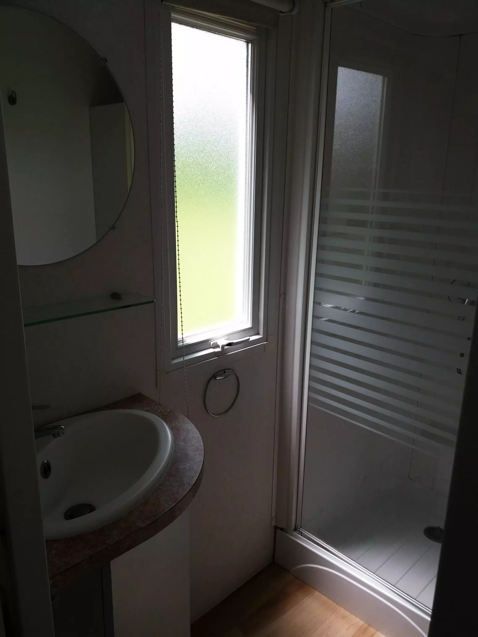 Mobil home 2 chambres (1 avec lit 140 x 190 et la 2ème 2 lits côte à côte 80 x 190) salon, cuisine équipée (gaz, frigo, micro-ondes, vaisselle), salle de bain, WC séparés. Belle terrasse extérieure non couverte avec salon de jardin
