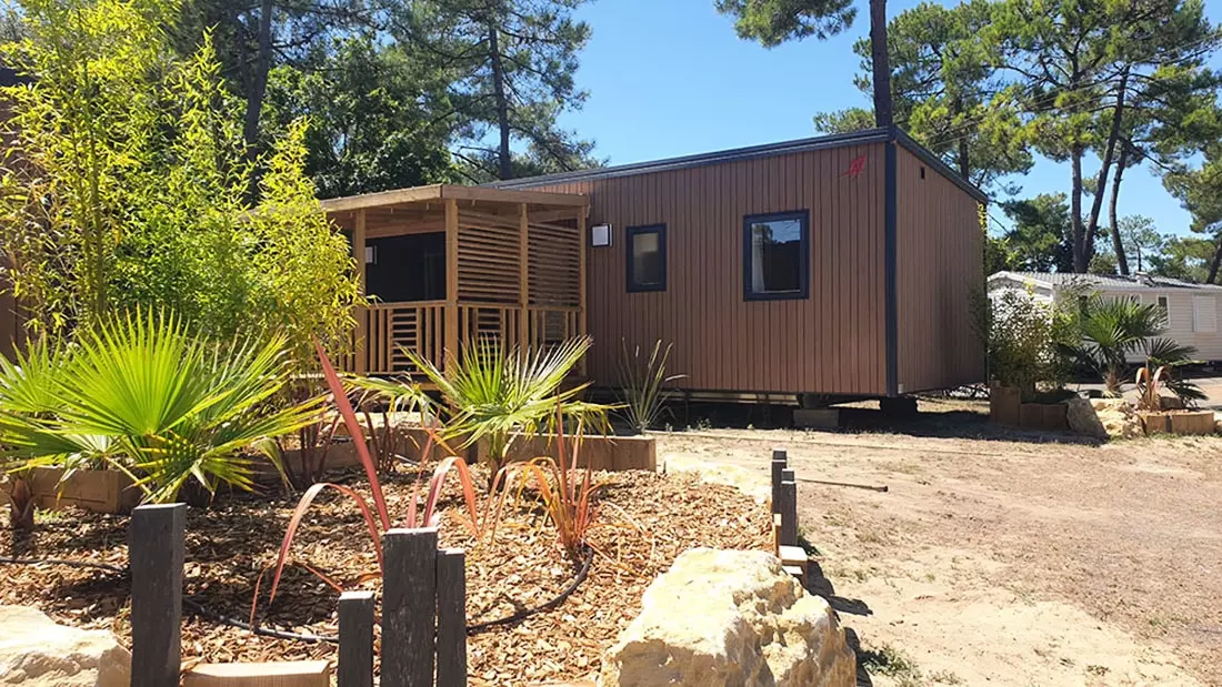 Le mobil-home comporte une pièce principale (avec un coin cuisine, un coin repas, et un espace salon avec banquette et télévision),3 chambres dont 1 avec un lit en 140 cm de large pour 2 personnes et 2 autres chambres avec 2 lits de 80 cm de large, un WC et une salle d'eau avec douche. Il donne sur une terrasse en bois semi couverte.