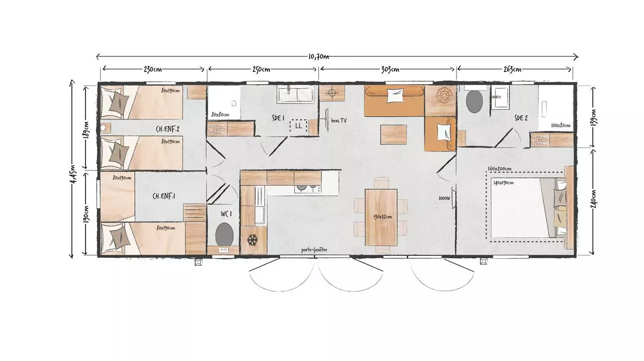 Mobil Home 4 pièces 7 personnes avec :