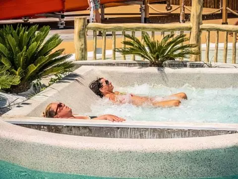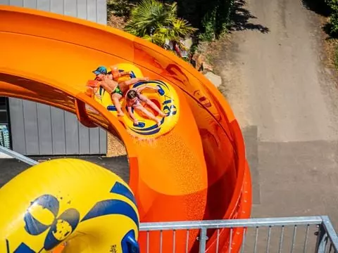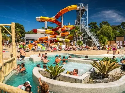 Vient s'ajouter un dernier espace avec 2 autres piscines extérieures chauffées, bain à remous, rivière de marche, pataugeoire chauffée, solarium et 7 pistes de toboggans dont un à bouées pour le plaisir des grands et des petits.
