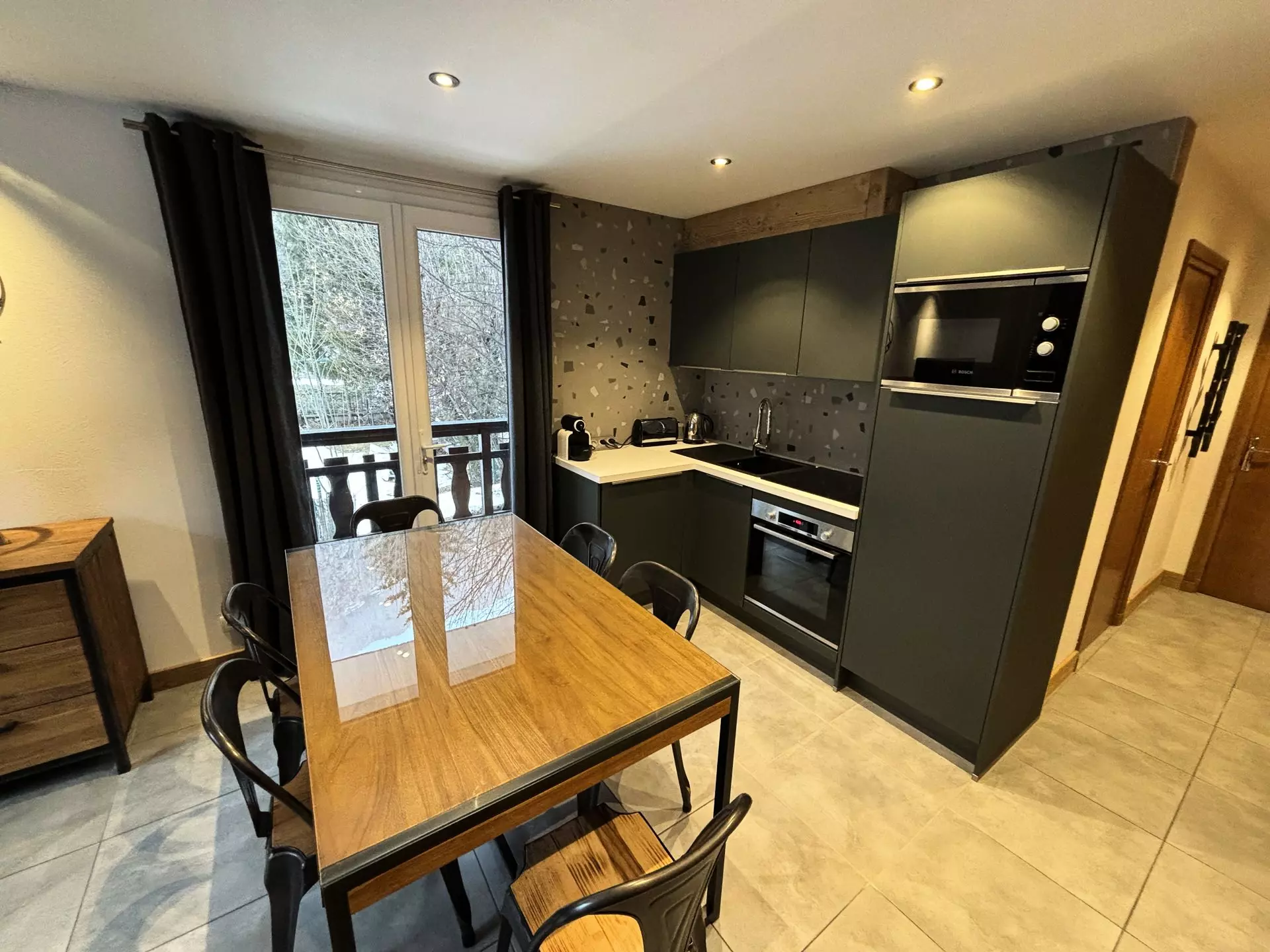 - Coin cuisine : four, plaque à induction (3 foyers), combiné réfrigérateur/ congélateur, micro-ondes et lave-vaisselle