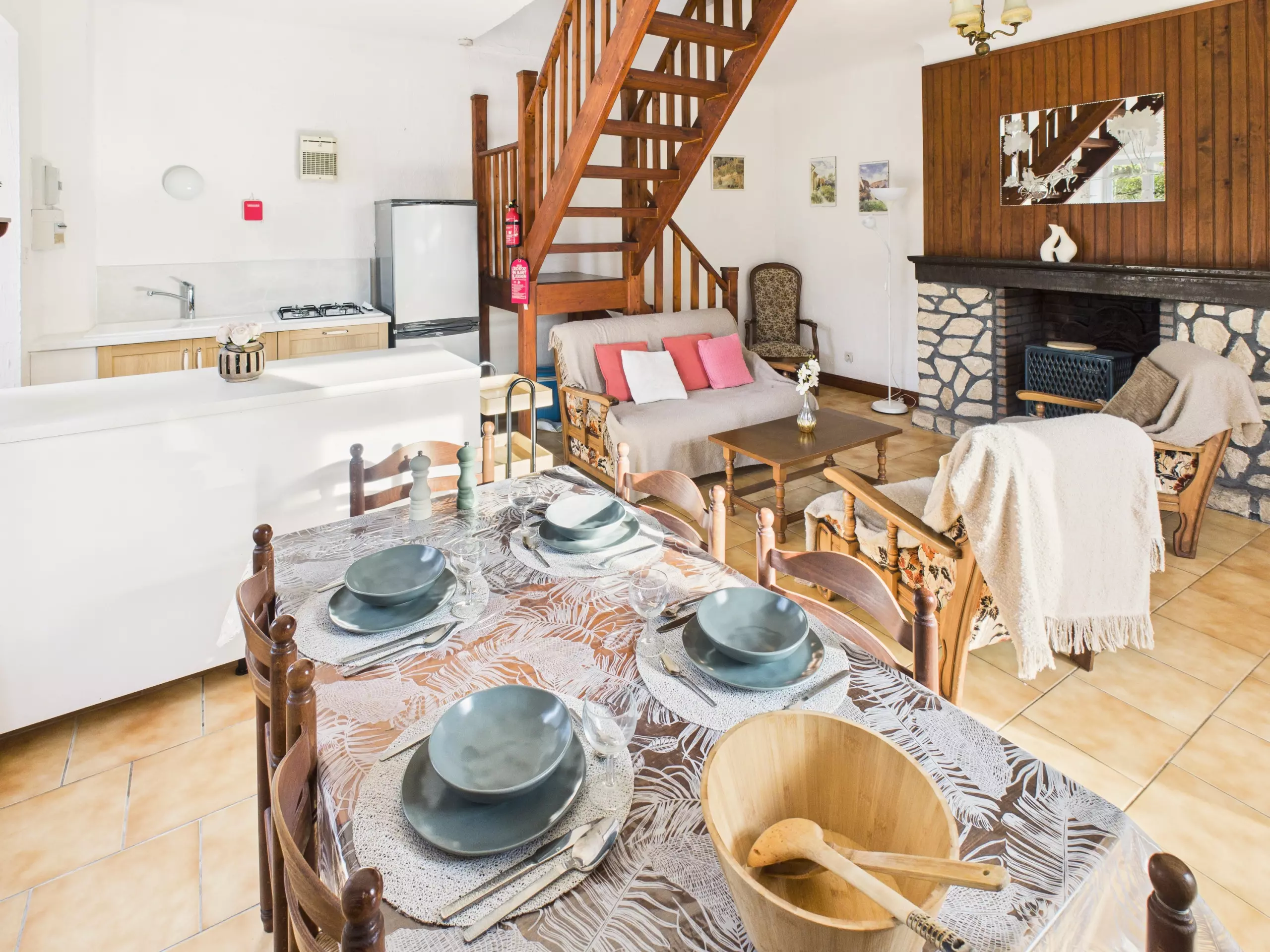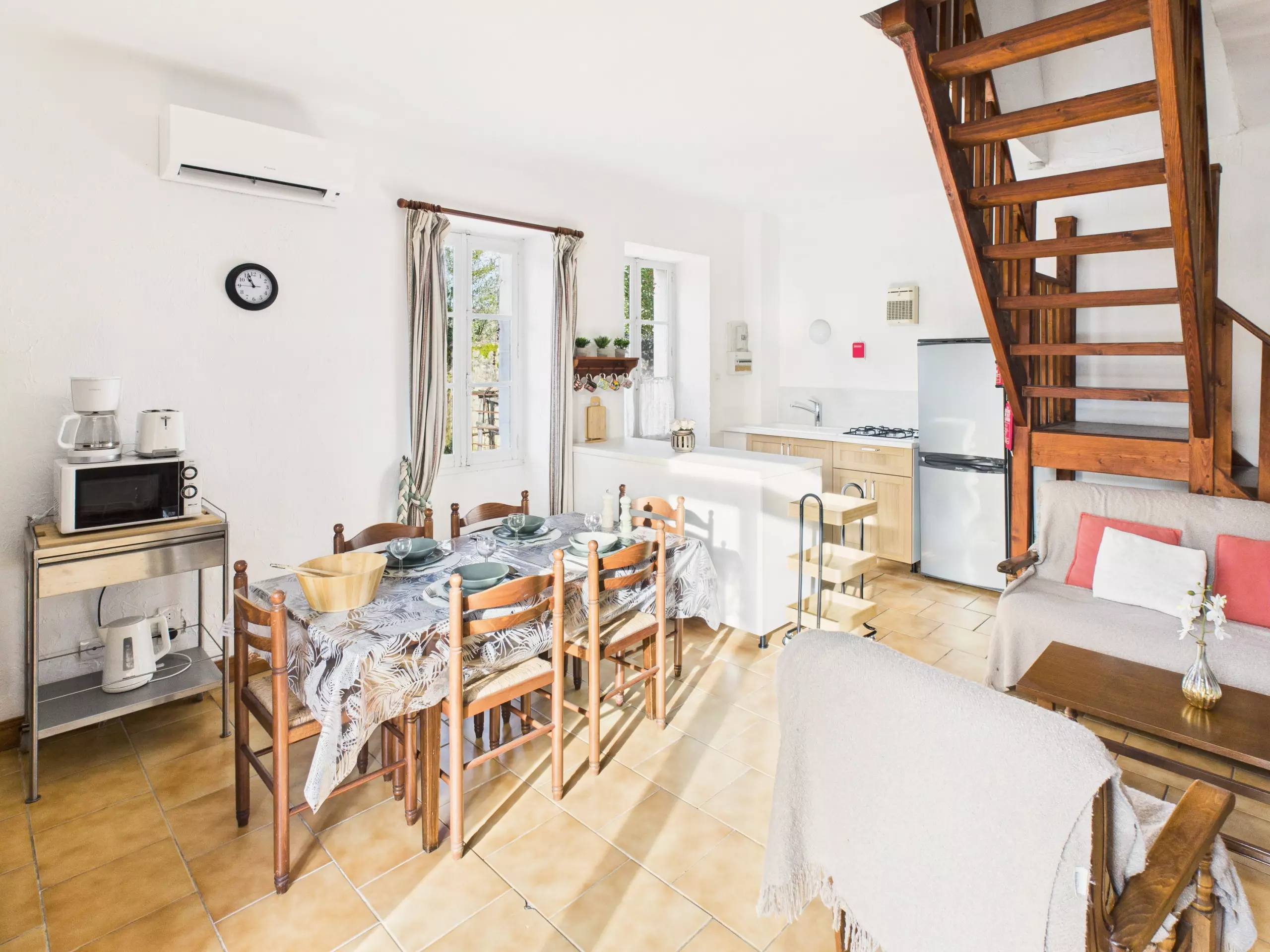 Passez la porte d'entrée et laissez-vous séduire par une agréable pièce de vie d'environ 30 m² équipée d'une climatisation réversible. La cuisine, ouverte est équipée d'un frigo, d'un congélateur, d'un four, d'un micro-onde ainsi que de tous les éléments nécessaires pour cuisiner. Pour vos petits-déjeuners, vous trouverez une cafetière à filtre, une bouilloire et un grille-pain. Partagez vos repas autour de la table à manger pour 4 personnes ou à l'air frais sur la terrasse. En soirée, détendez-vous dans l'espace salon, idéal pour se retrouver en famille ou entre amis, avec son canapé, ses fauteuils confortable et sa table basse.
