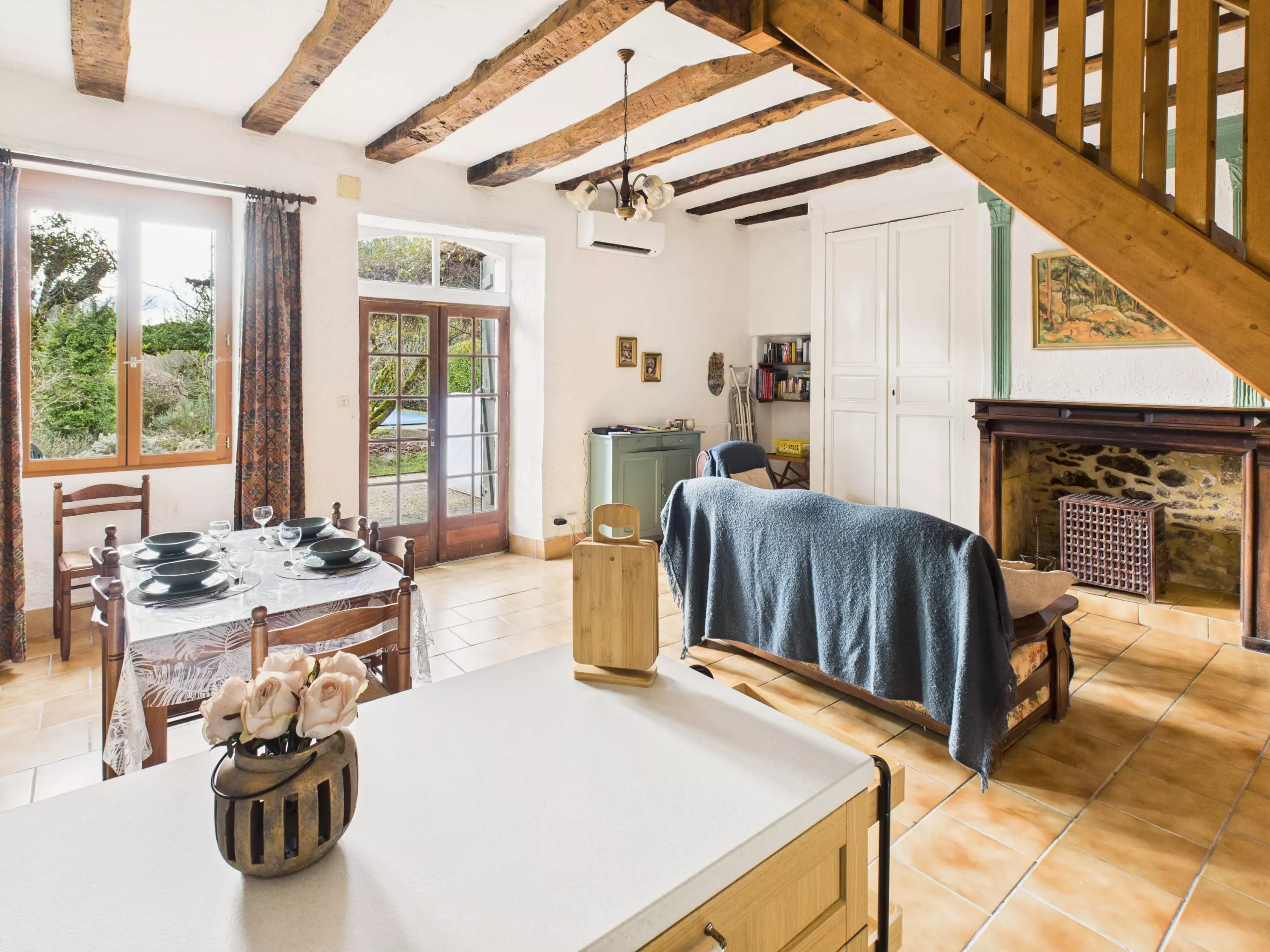 Passez la porte d'entrée et laissez-vous séduire par une agréable pièce de vie d'environ 30 m² équipée d'une climatisation réversible. La cuisine, ouverte est équipée d'un frigo, d'un congélateur, d'un four, d'un micro-onde ainsi que de tous les éléments nécessaires pour cuisiner. Pour vos petits-déjeuners, vous trouverez une cafetière à filtre, une bouilloire et un grille-pain. Partagez vos repas autour de la table à manger pour 4 personnes ou à l'air frais sur la terrasse. En soirée, détendez-vous dans l'espace salon, idéal pour se retrouver en famille ou entre amis, avec son canapé confortable et sa table basse.