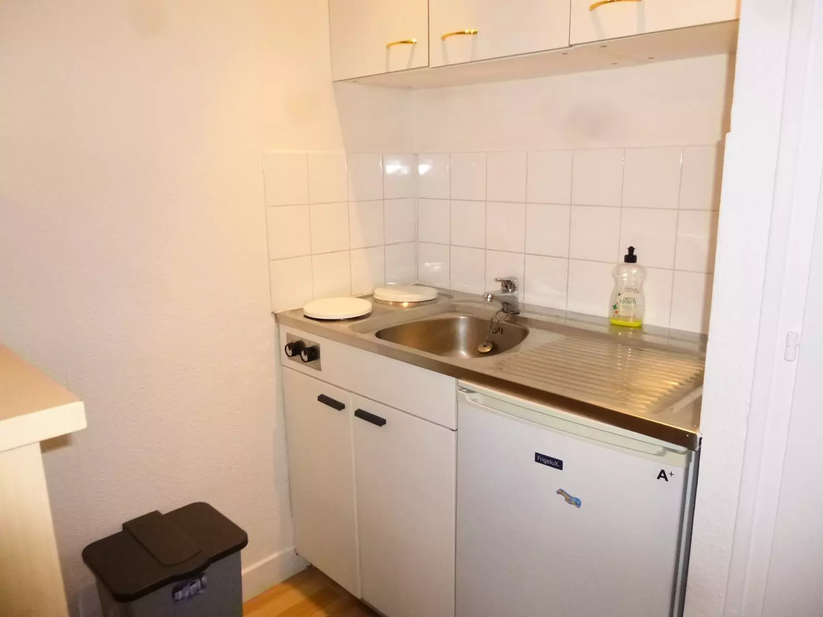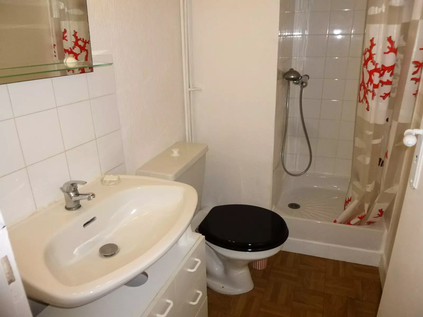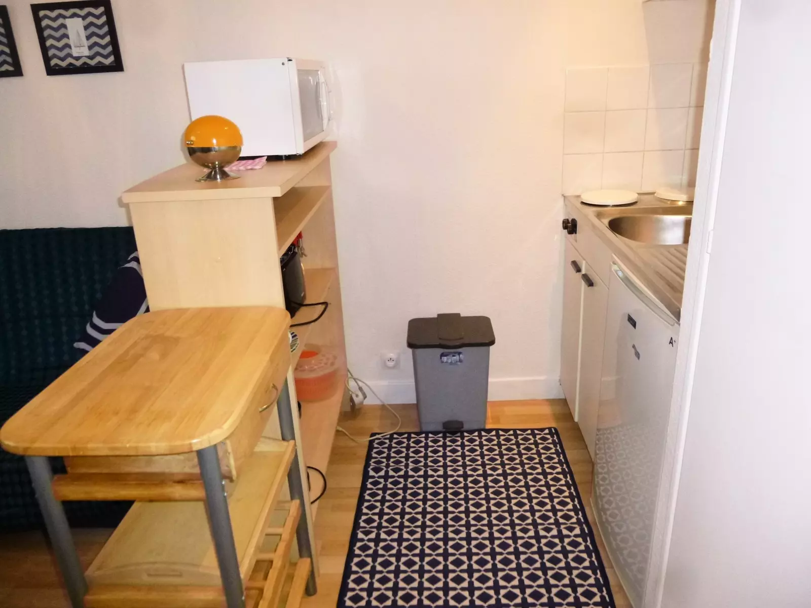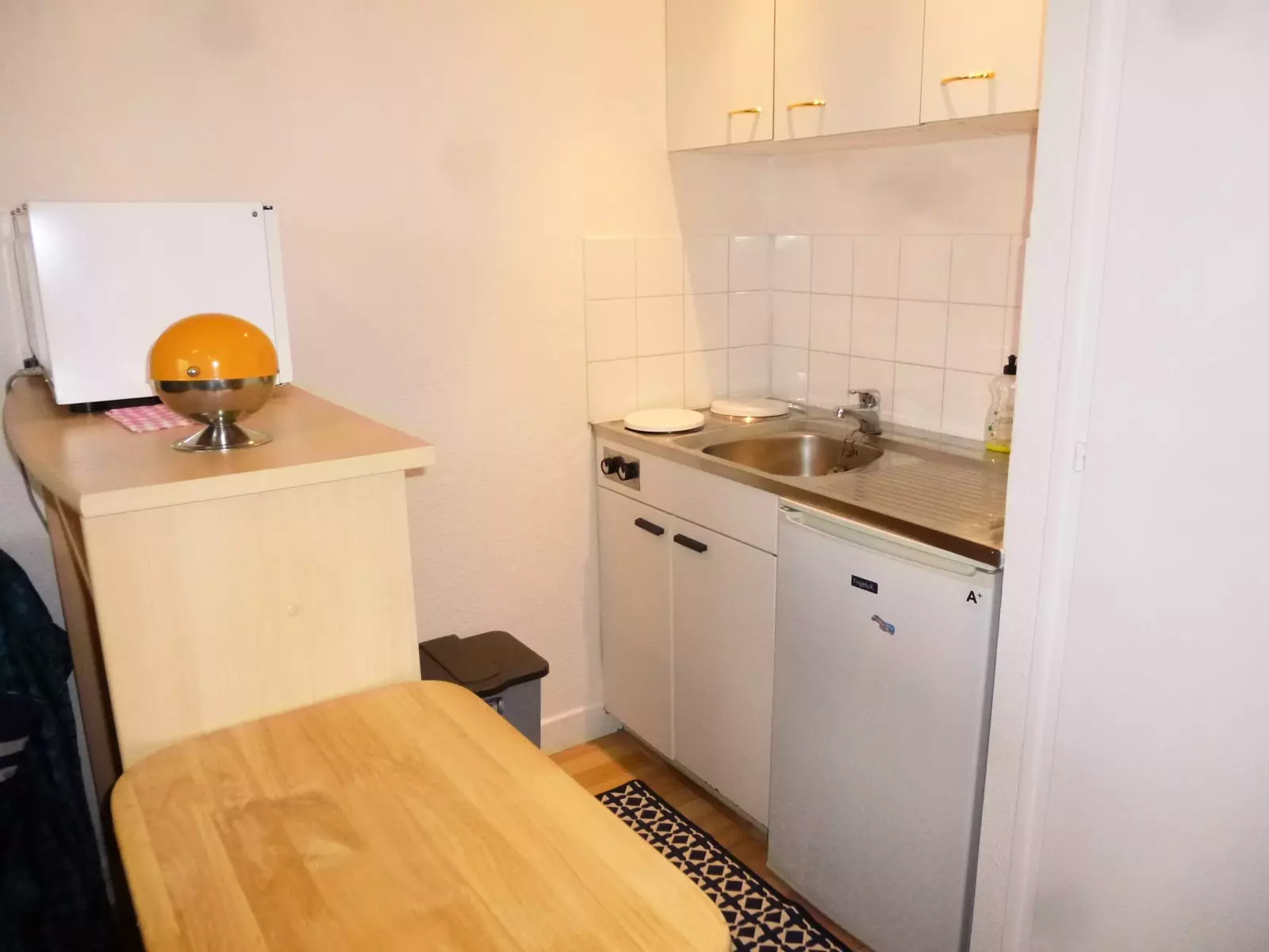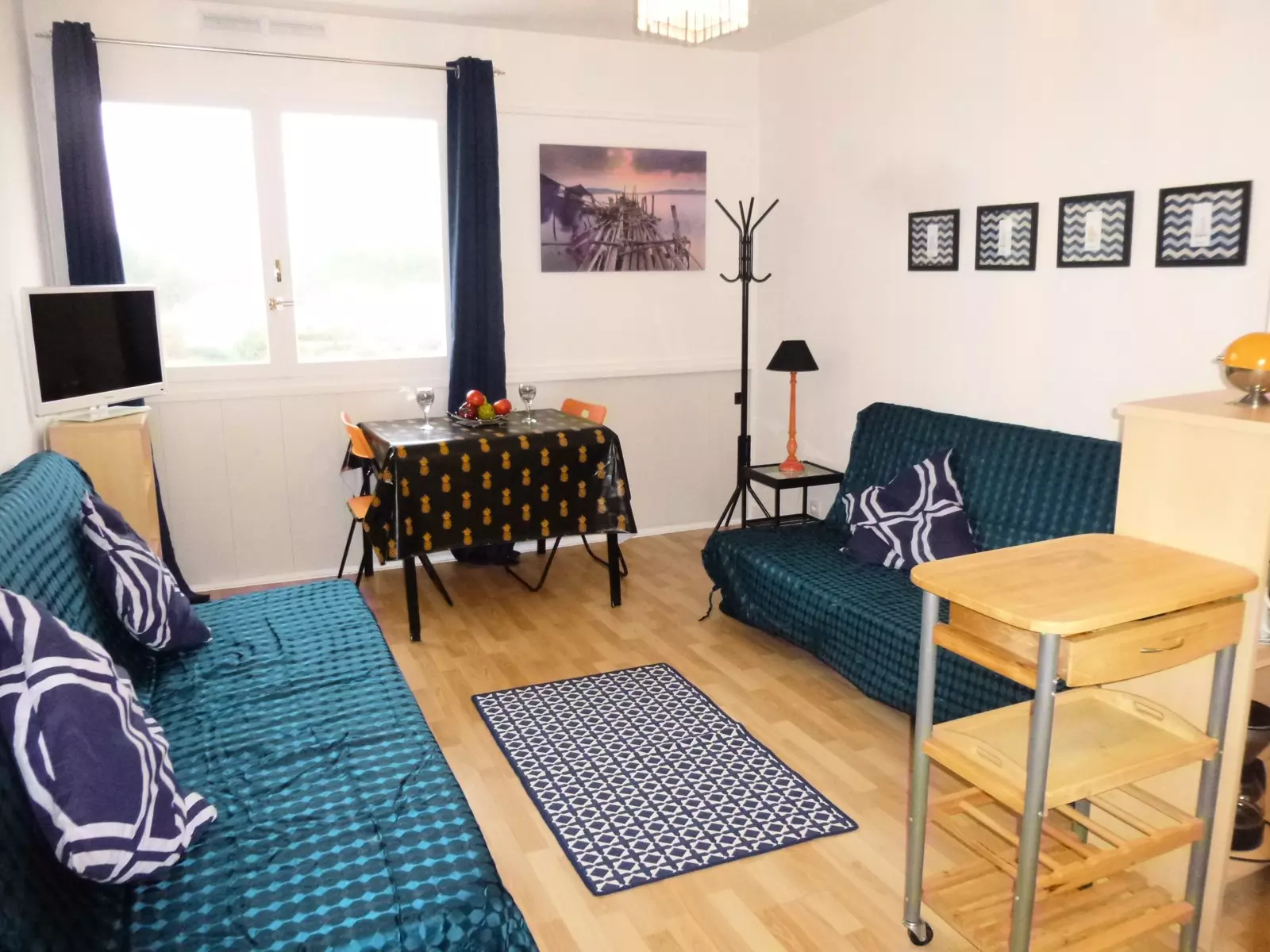 Cet appartement de vacances est situé au 1er étage avec ascenseur et comprend un séjour avec deux canapés clic-clac 2 places et télévision, un coin cuisine équipé (plaques électrique, micro-ondes), une salle d'eau avec wc.