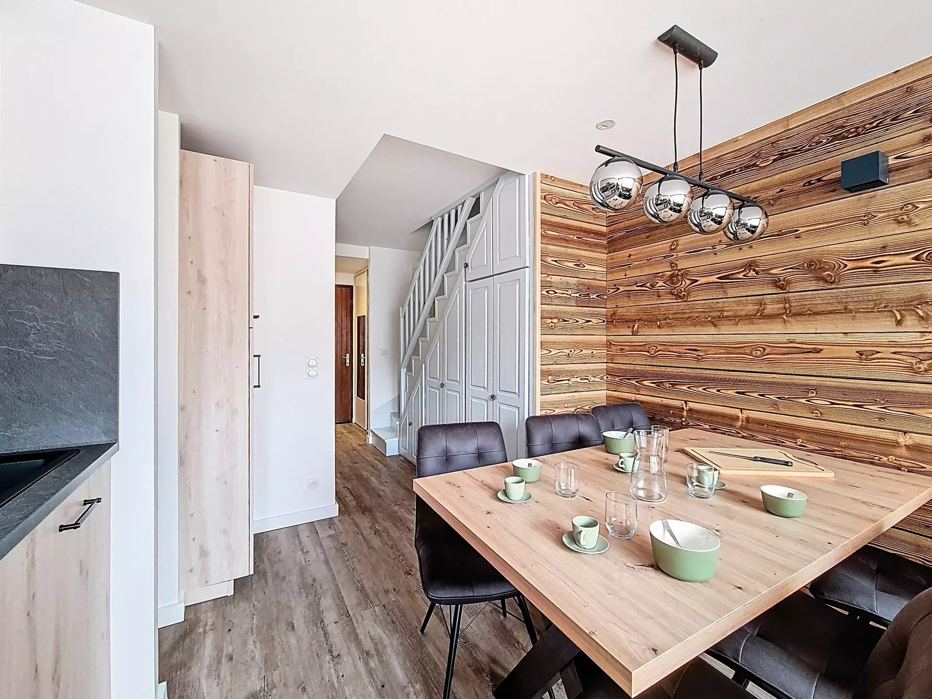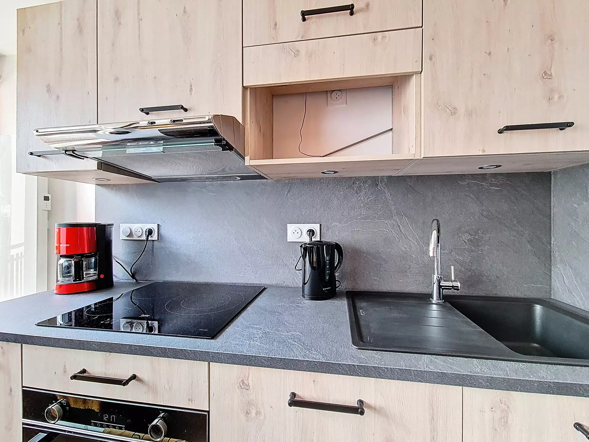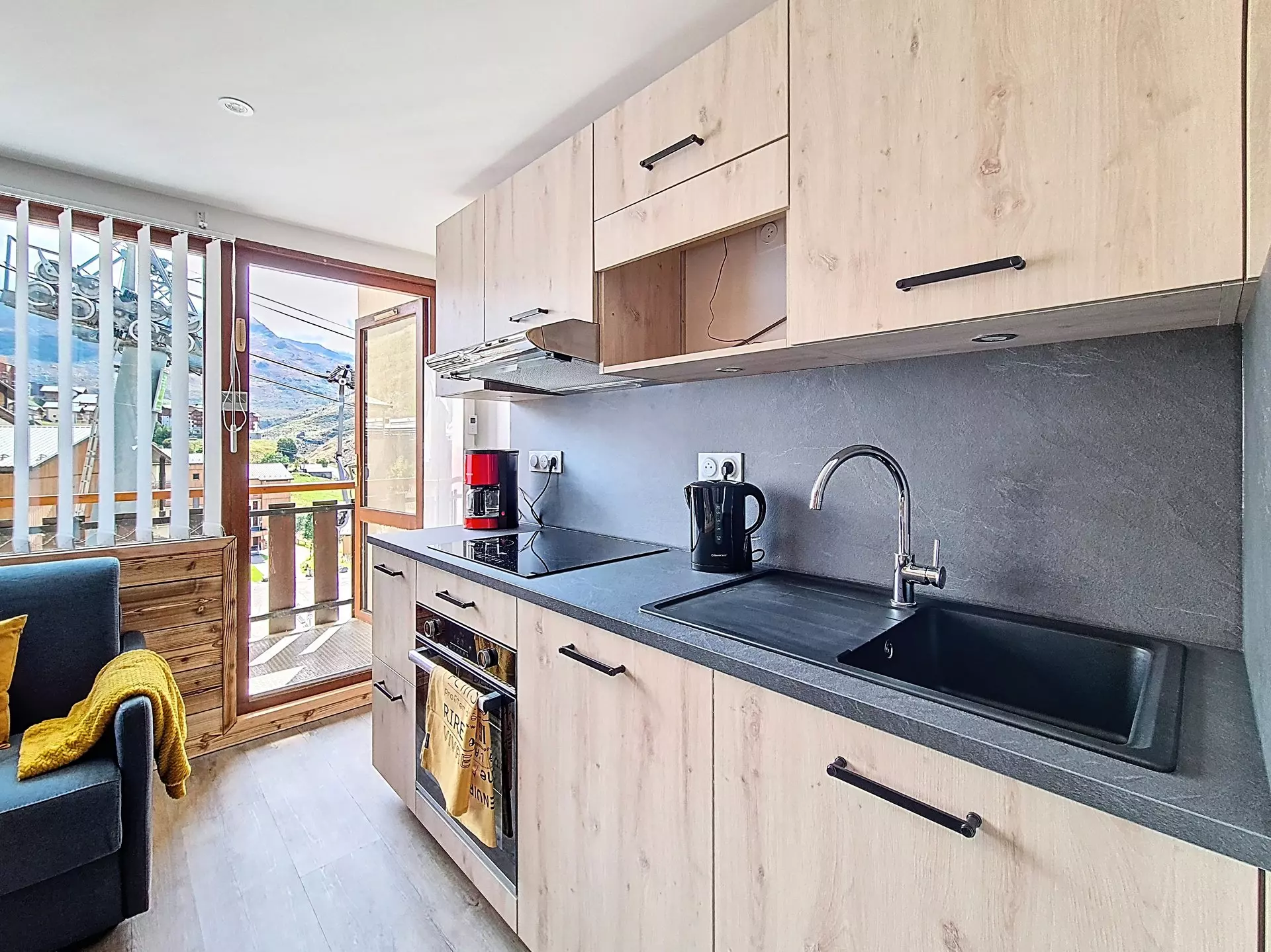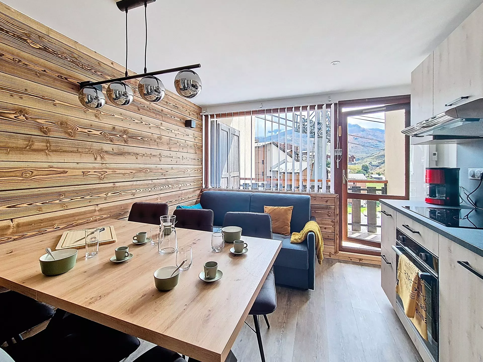 Cuisine : réfrigérateur, 2 plaques électriques, four traditionnel, four micro-ondes, mini lave-vaisselle, cafetière, grille-pain et bouilloire électriques, appareil à raclette.