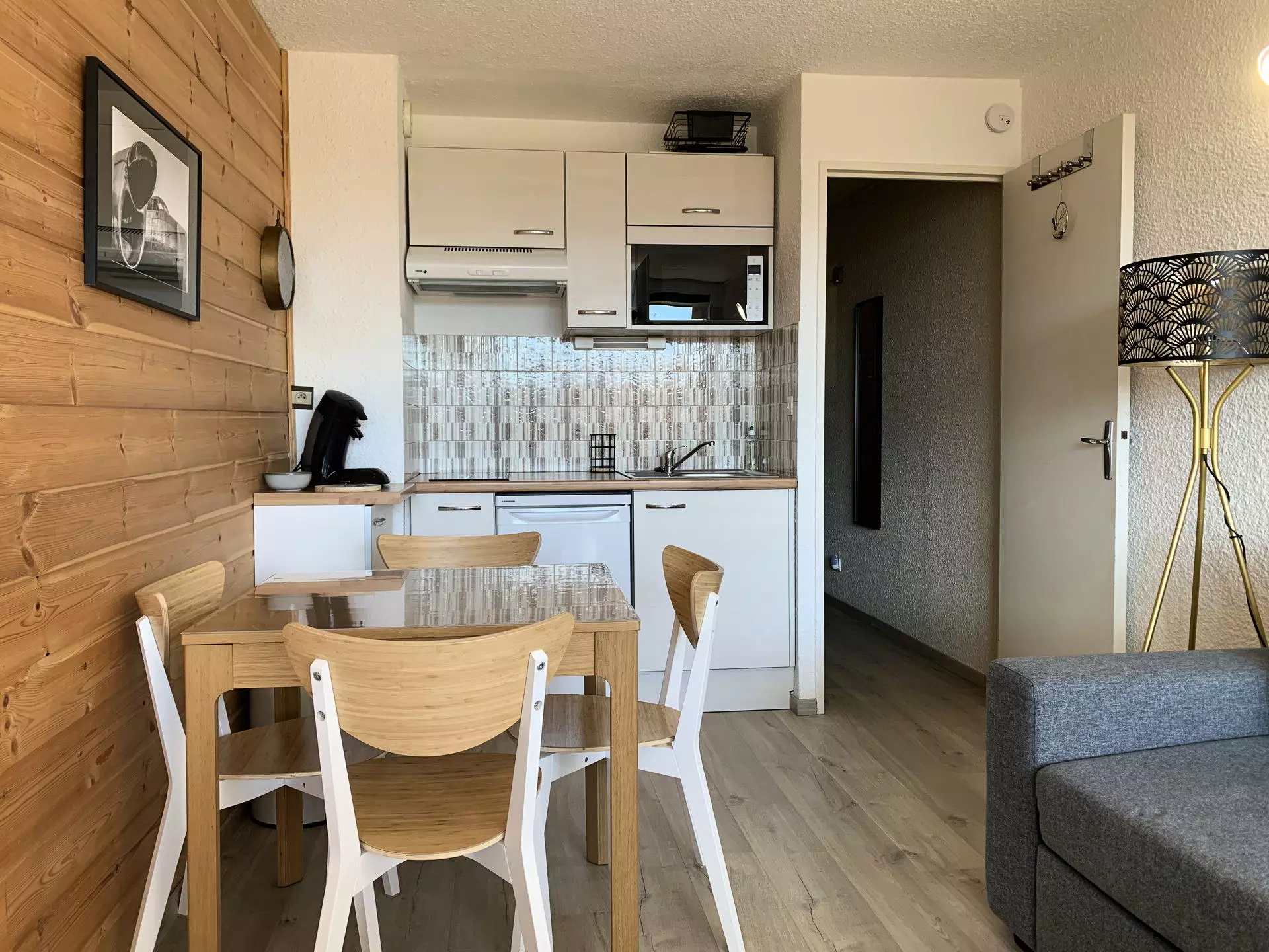 * Coin cuisine : Réfrigérateur top, 2 plaques éléctriques, micro-ondes, cafetière nespresso, bouilloire, grille pain, appareil à raclette, appareil à gauffre