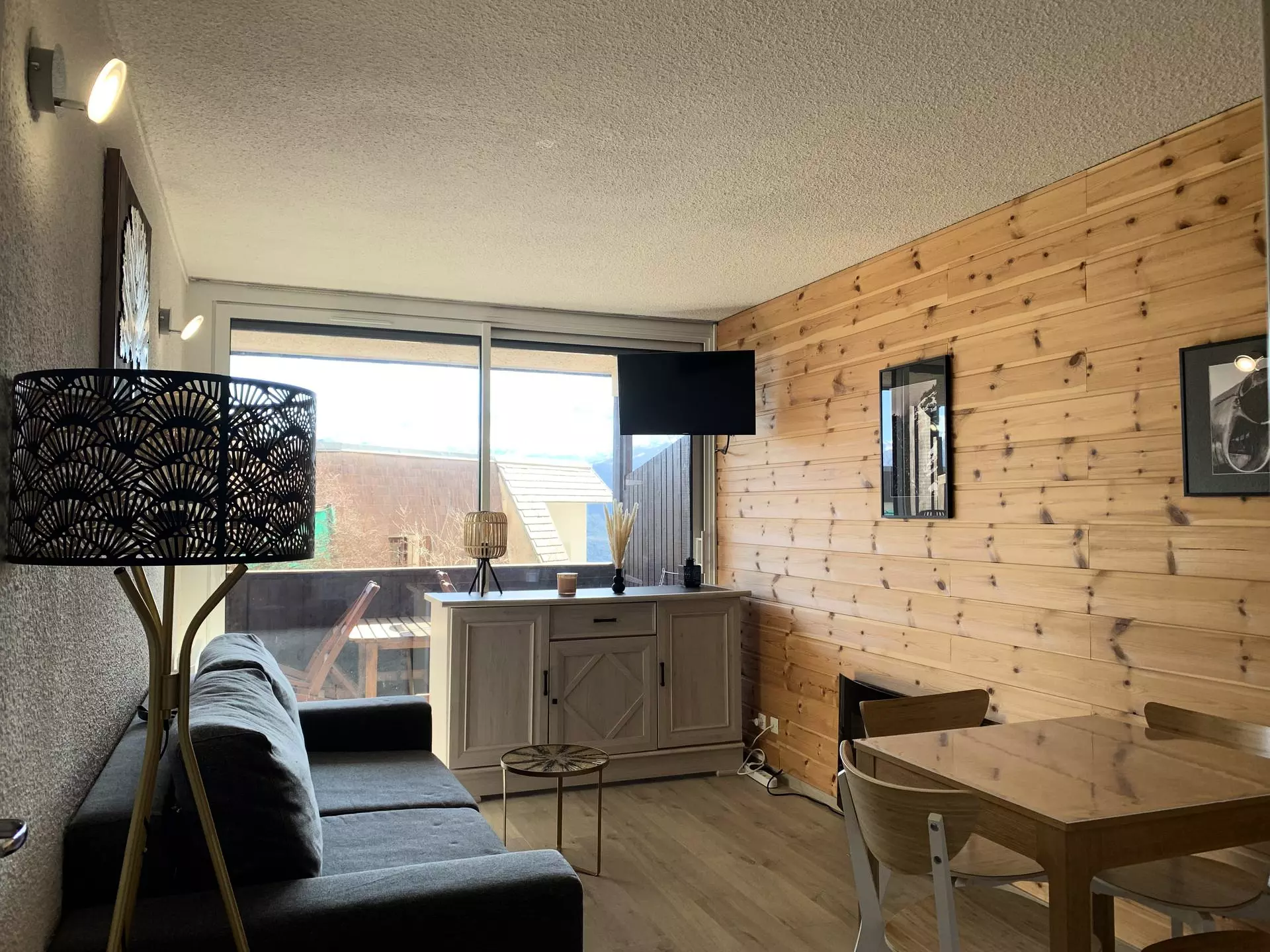 * Séjour : 1 canapé convertible 2 places, grande TV HD (105cm), accès balcon, coin repas ;