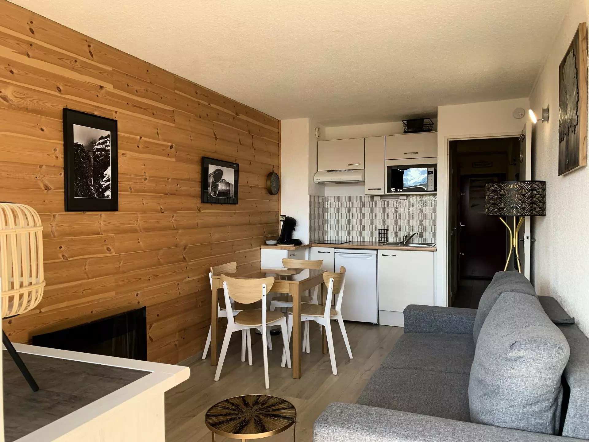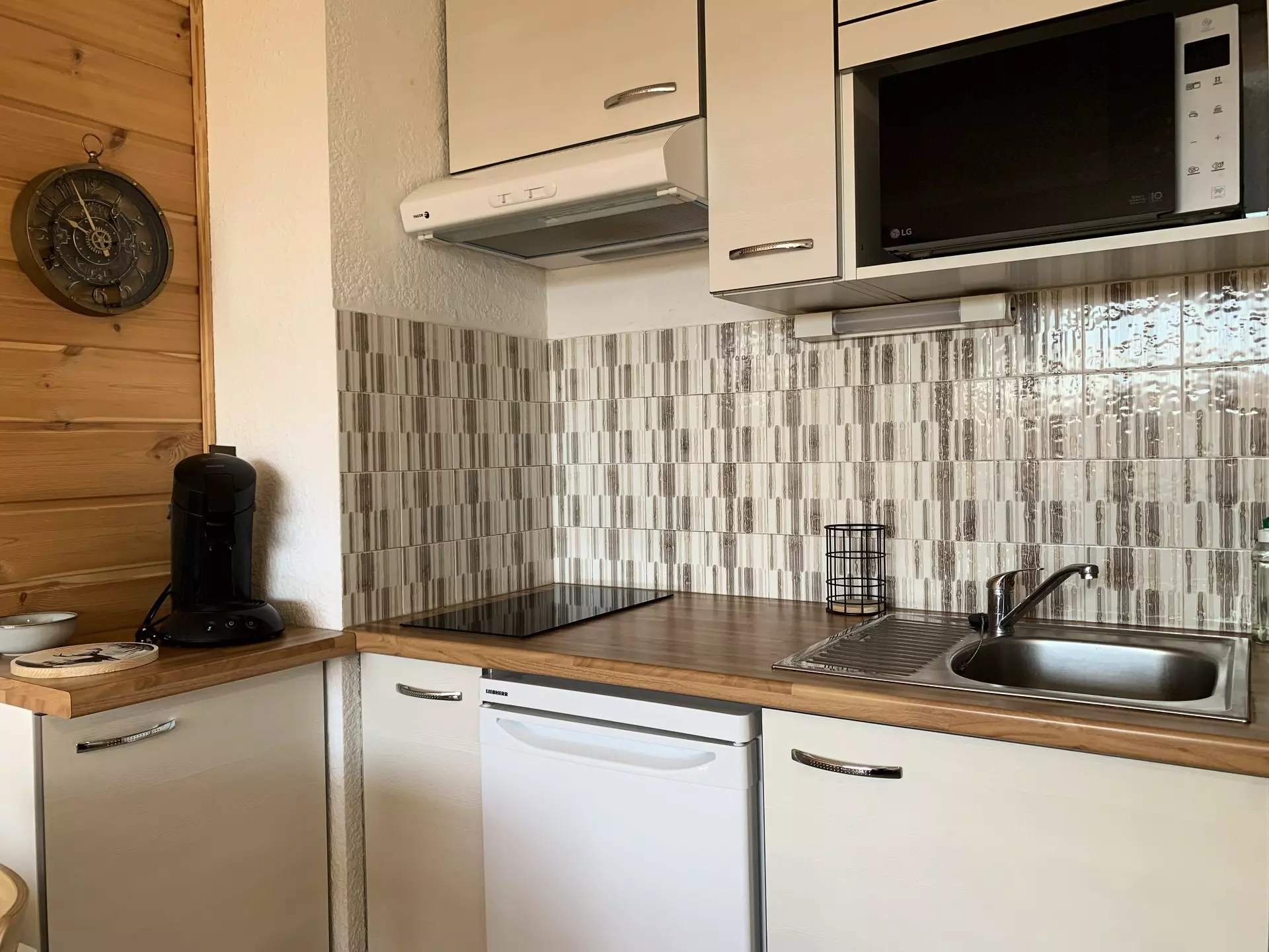* Coin cuisine : Réfrigérateur, 2 plaques vitrocéramiques, micro-ondes grill, cafetière Tassimo, bouilloire, grille pain, appareil à raclette, appareil à fondue, grill ;