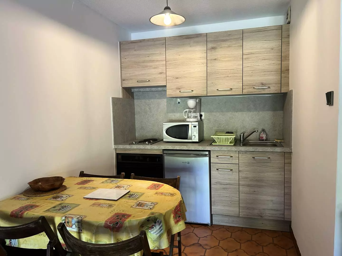 Cette location de vacances au 1er etage offre une terrasse conviviale exposée Sud Ouest, un séjour avec canapé lits gigognes, une chambre avec lit double ouvrant sur la terrasse, une kitchenette, une salle d'eau et un wc indépendant.