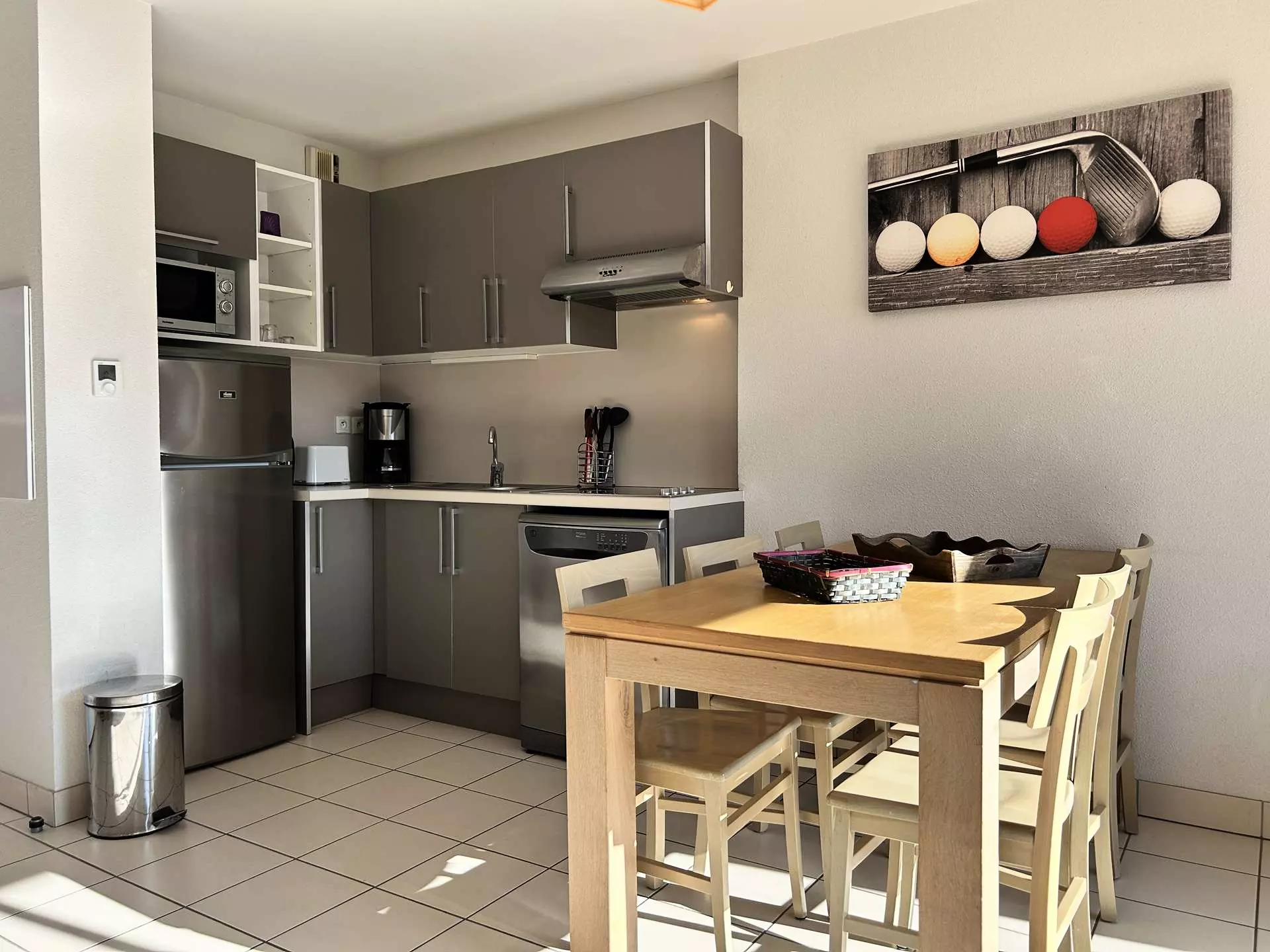 Une cuisine ouverte, entièrement aménagée : évier, plaques à induction 4 feux, hotte, micro-ondes multifonction, réfrigérateur-congélateur, lave-vaisselle, lave-linge, grille-pain, cafetière et bouilloire ;
