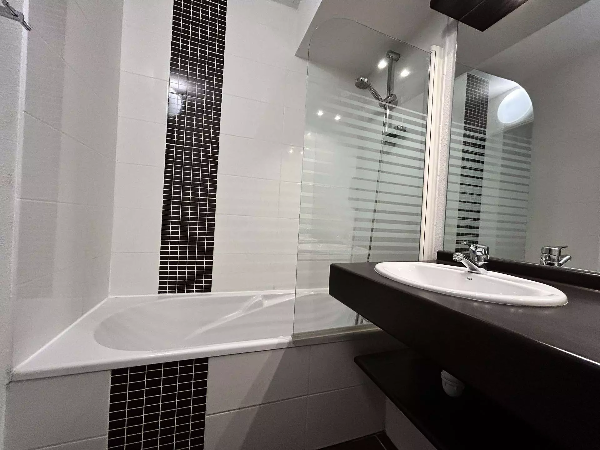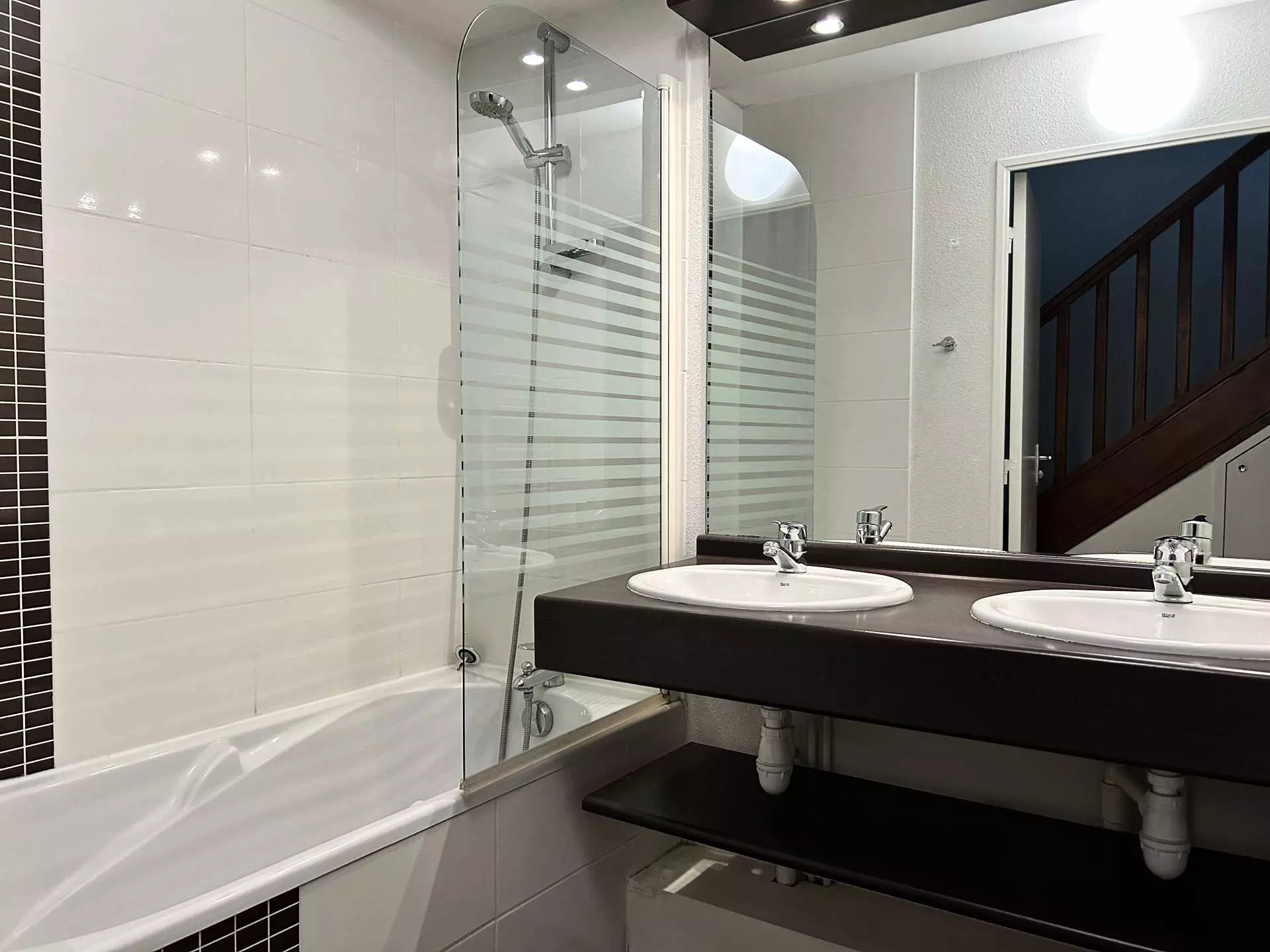 - Une salle de bain équipée d'une baignoire avec paroi de douche, ainsi qu'une double vasque ;