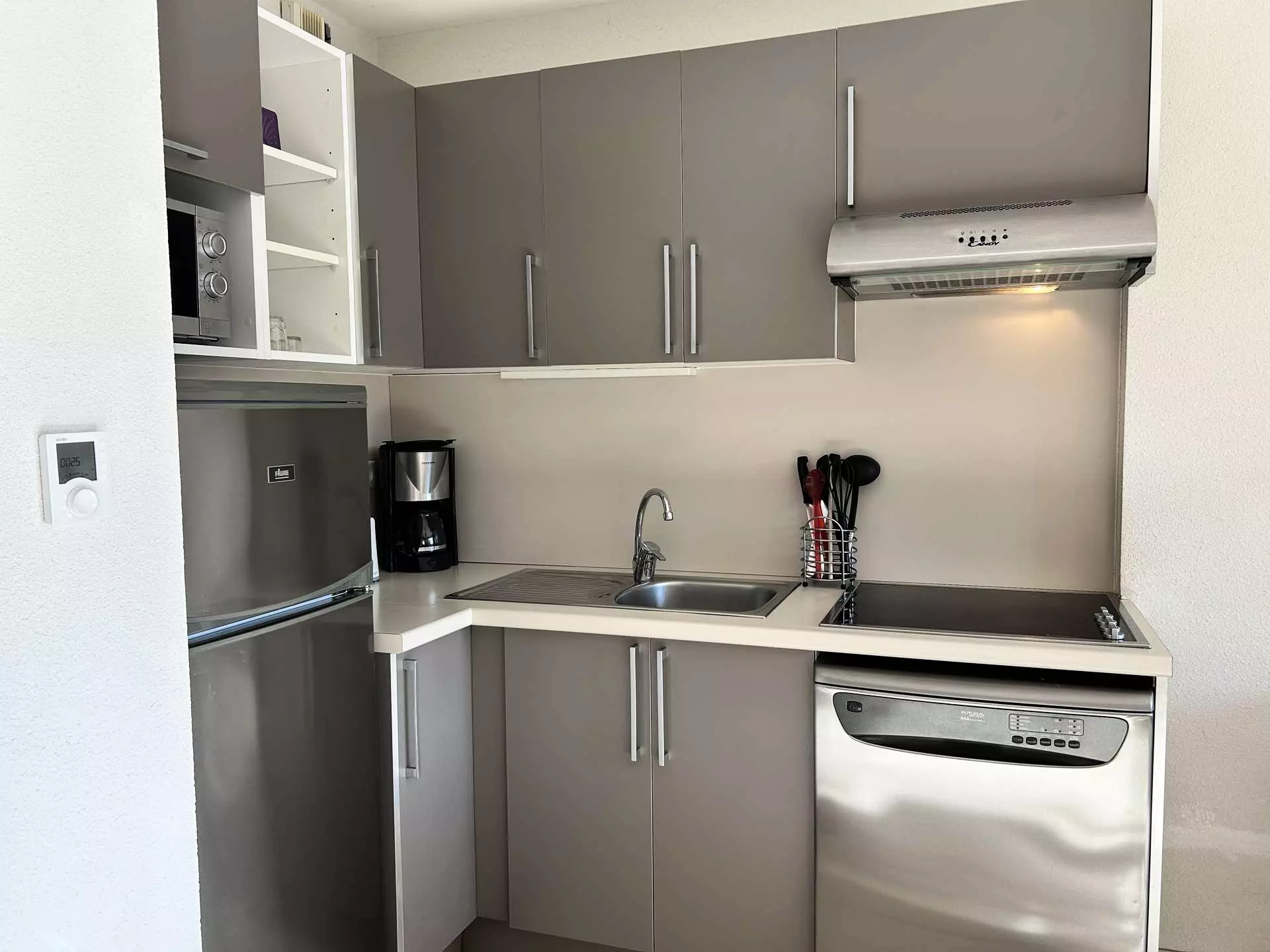 - Une cuisine ouverte, entièrement équipée, avec un évier, des plaques à induction 4 foyers, une hotte, un micro-ondes multifonction, un réfrigérateur-congélateur, un lave-vaisselle, un grille-pain, une cafetière et une bouilloire ;