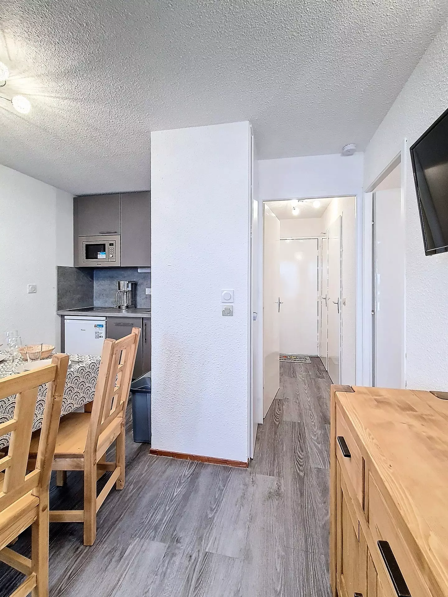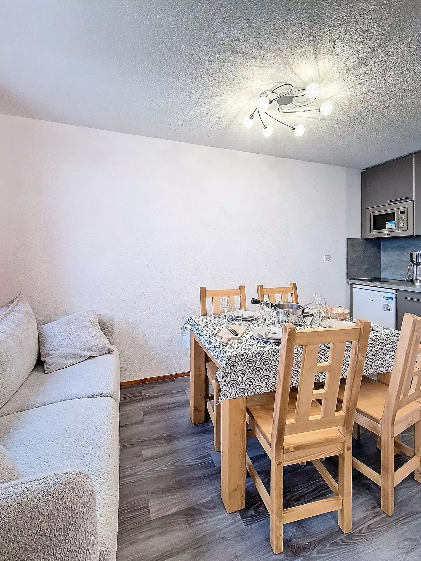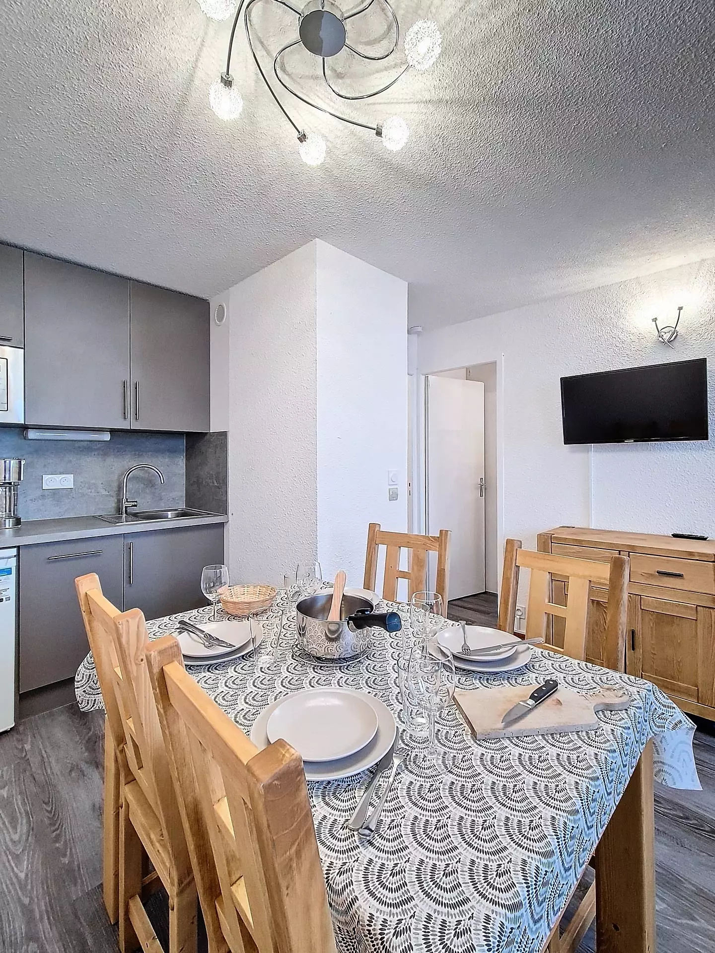 Cuisine équipée de 3 plaques électriques, four électrique, micro-ondes, réfrigérateur, lave-vaisselle, bouilloire, grille-pain, cafetière classique et Senseo.