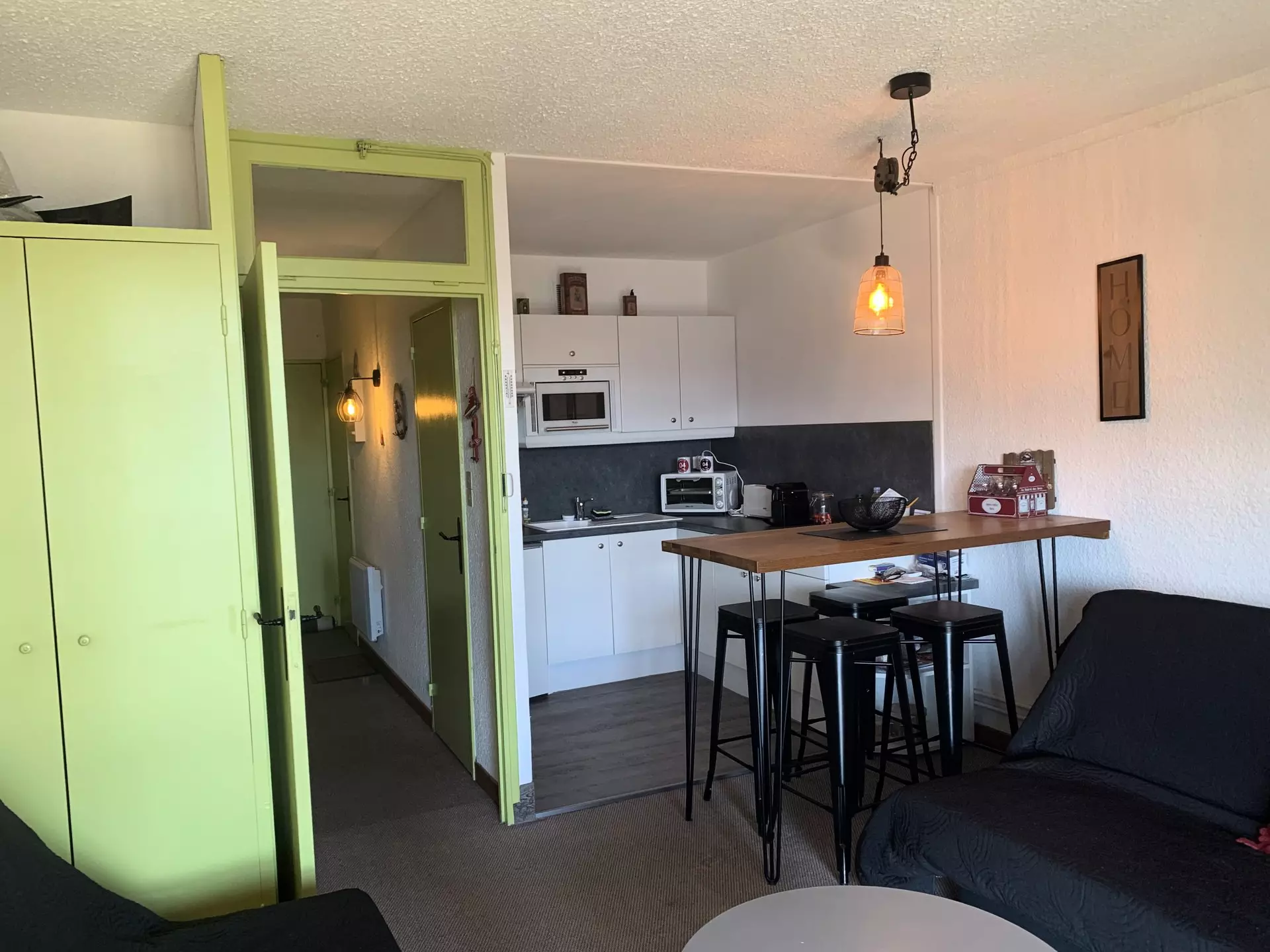 * Cuisine ouverte : plaques électriques, four micro-ondes, mini four électrique, frigo top, hotte, cafetière Senseo, grille pain ;