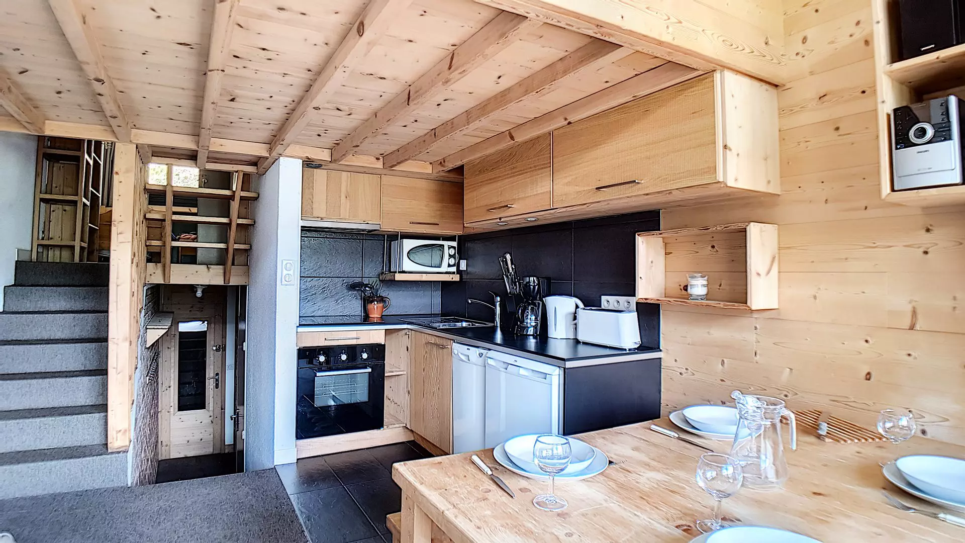 Cuisine incorporée 2 plaques vitro céramiques, mini four et four micro-ondes, réfrigérateur, lave-vaisselle, grille-pain, cafetière et bouilloire.