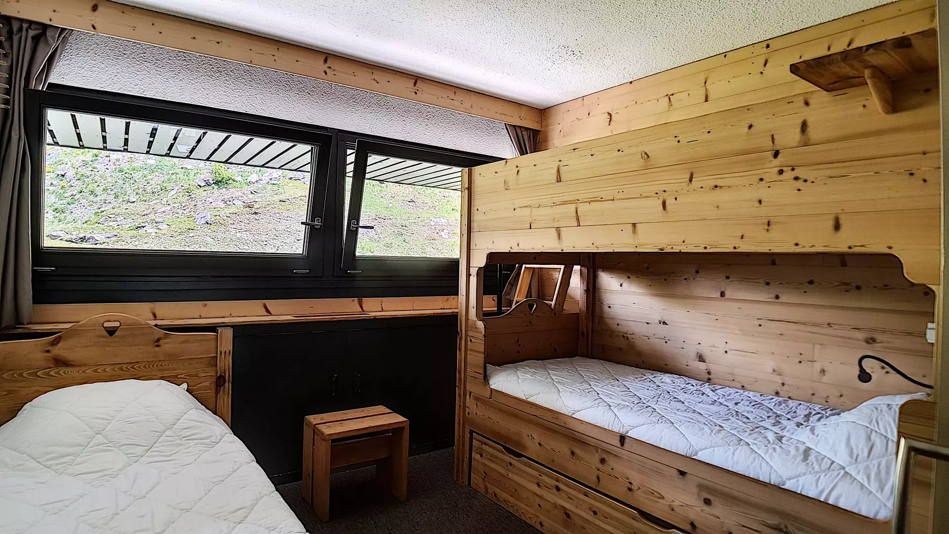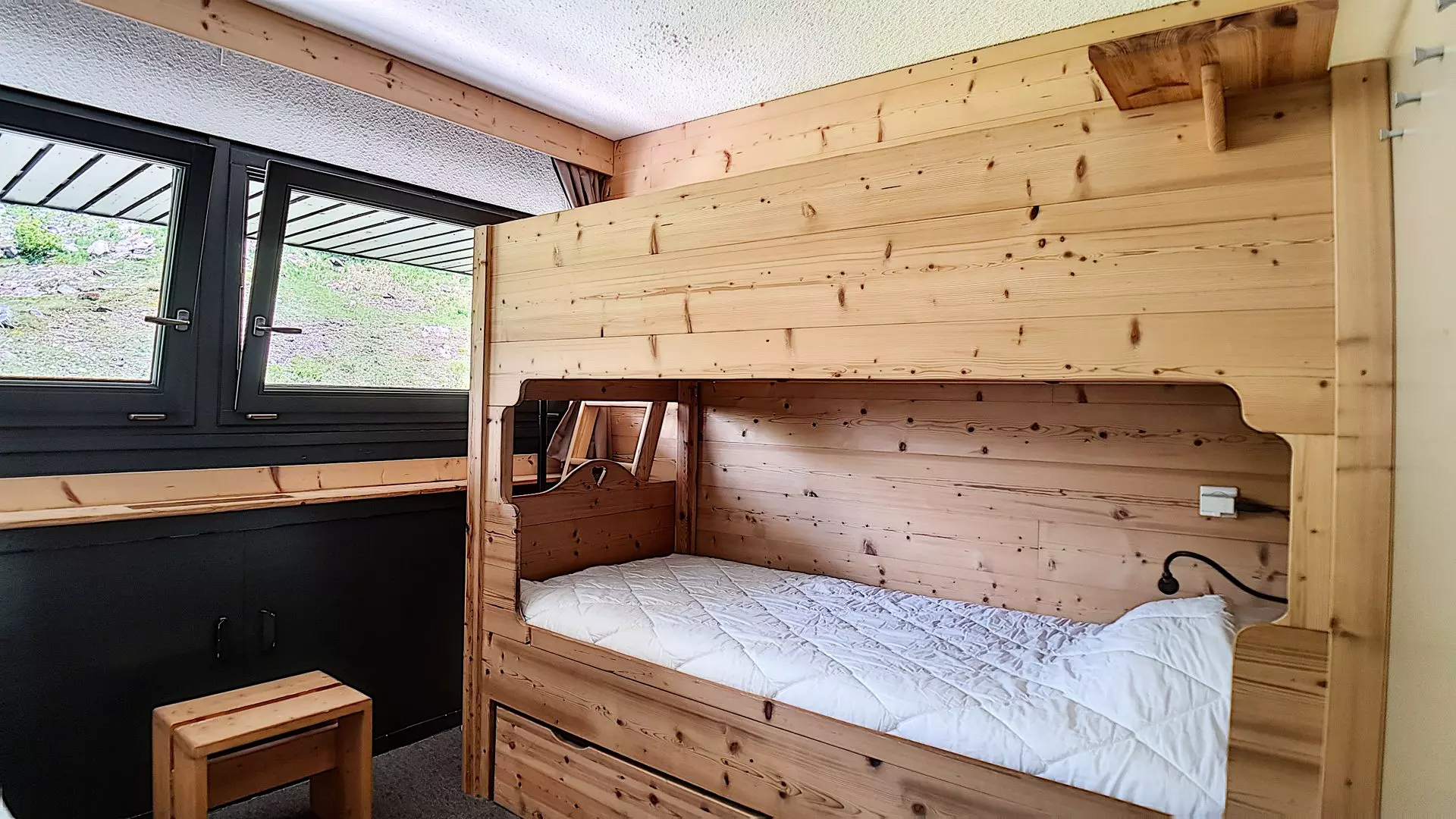 Chambre: 1 lit simple + 2 lits superposés. Le couchage en hauteur ne convient pas aux enfants de moins de 6 ans.