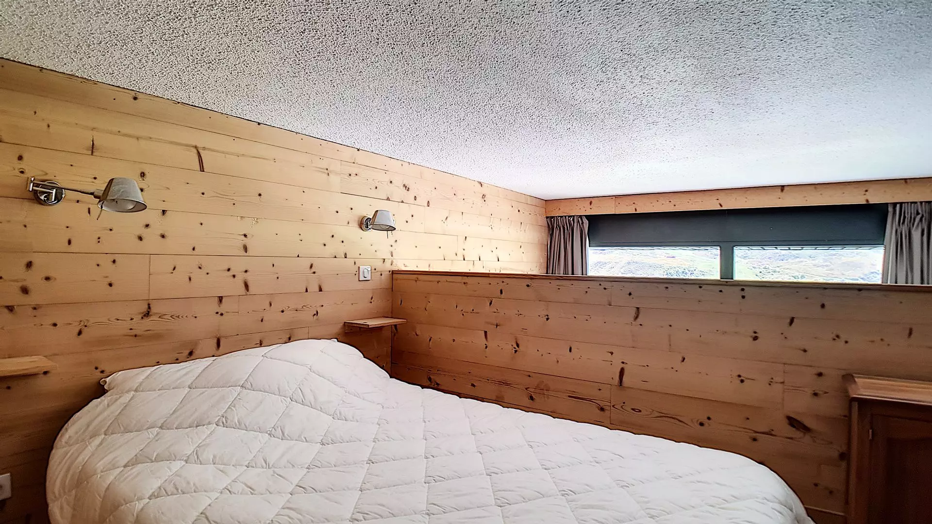 Chambre 2 : (en mezzanine non fermée, avec fenêtres, et donnant directement sur le séjour - hauteur sous plafond : 1.60m) : 1 lit double.