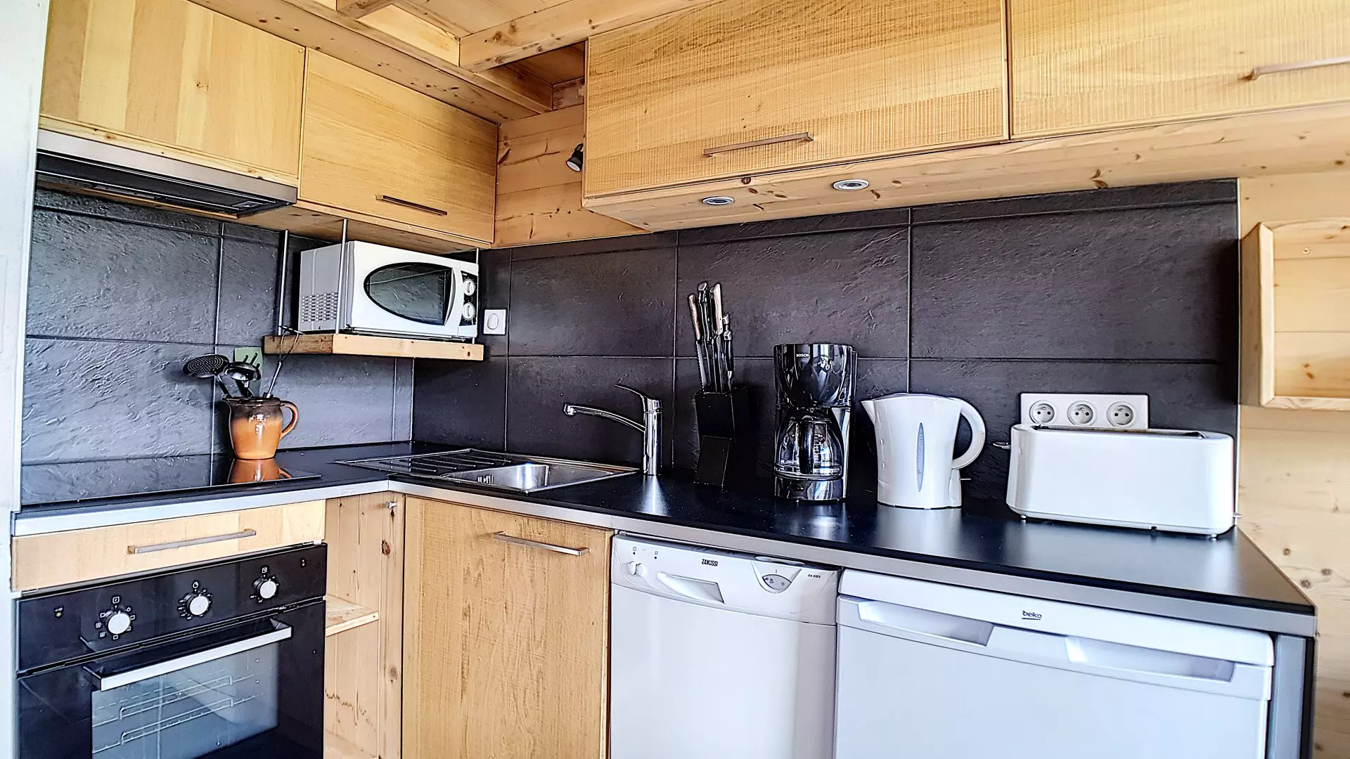Cuisine incorporée 2 plaques vitrocéramiques + hotte, lave vaisselle, combi four/micro ondes, réfrigérateur, bouilloire, cafetière et grille-pain