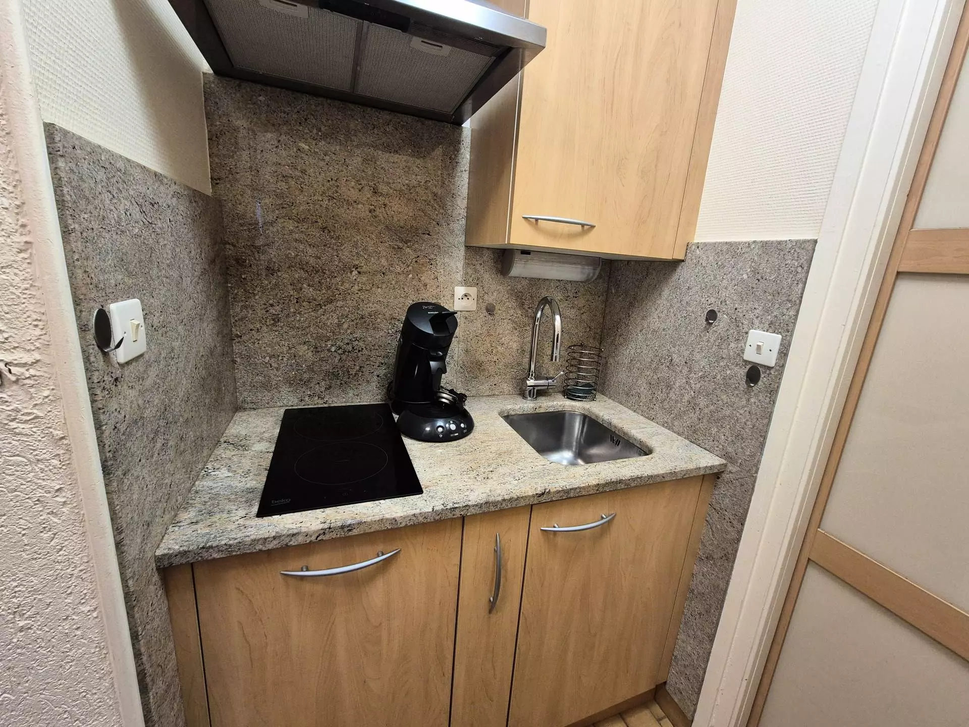 Bloc cuisine ouvert sur entrée (pvc) : 1 plaque induction, évier, 1 micro-ondes, réfrigérateur, cafetière électrique, mini-bouilloire, grille pain, vaisselle et batterie de cuisine.