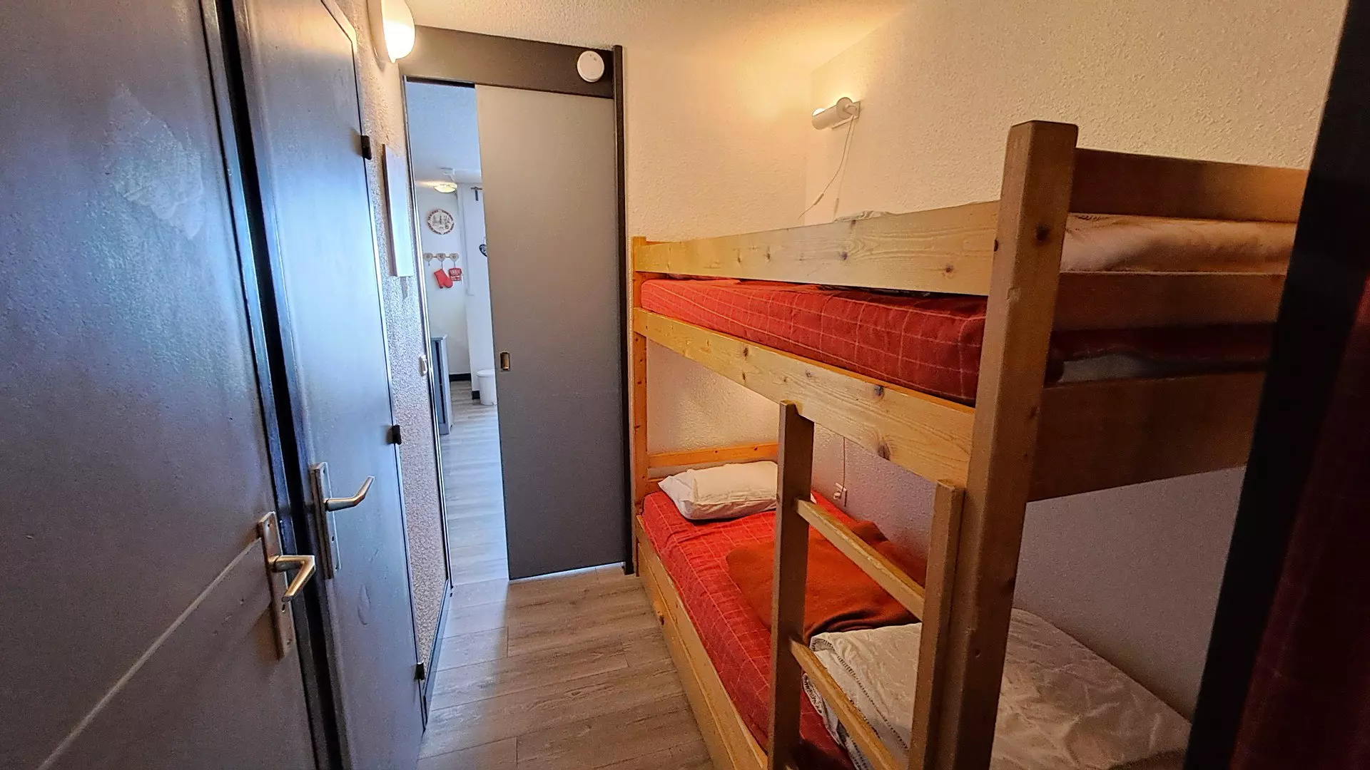 Le coin nuit est situé dans le couloir séparé du salon par une porte coulissante.