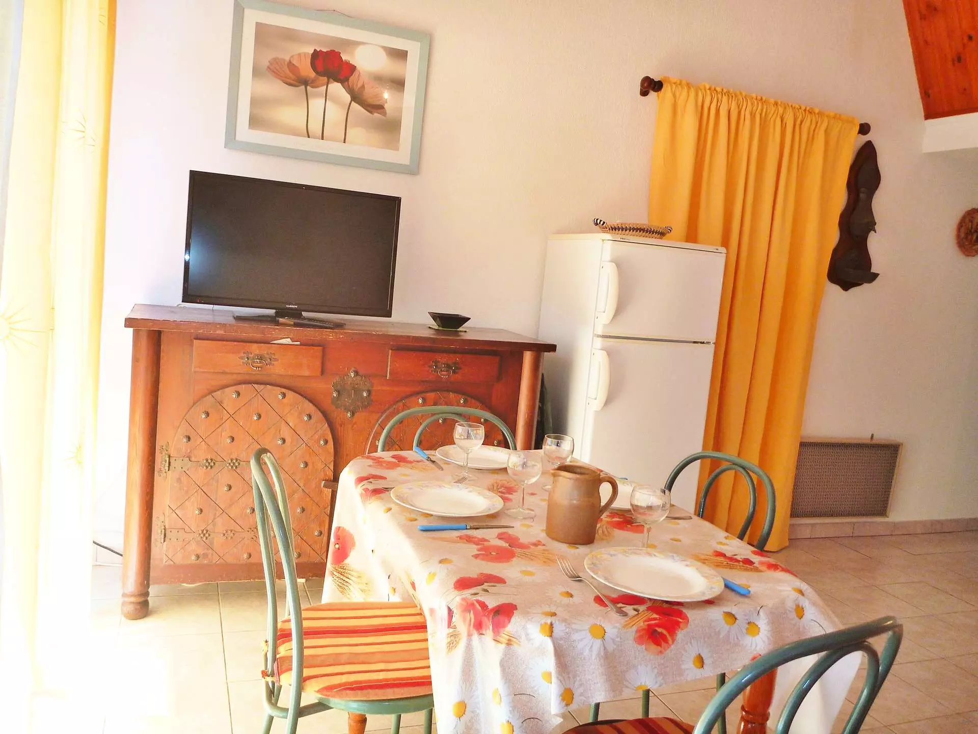 Séjour lumineux : Le salon dispose d'une table, de chaises, d'une télévision, et d'un canapé (non convertible), pour des moments conviviaux.
