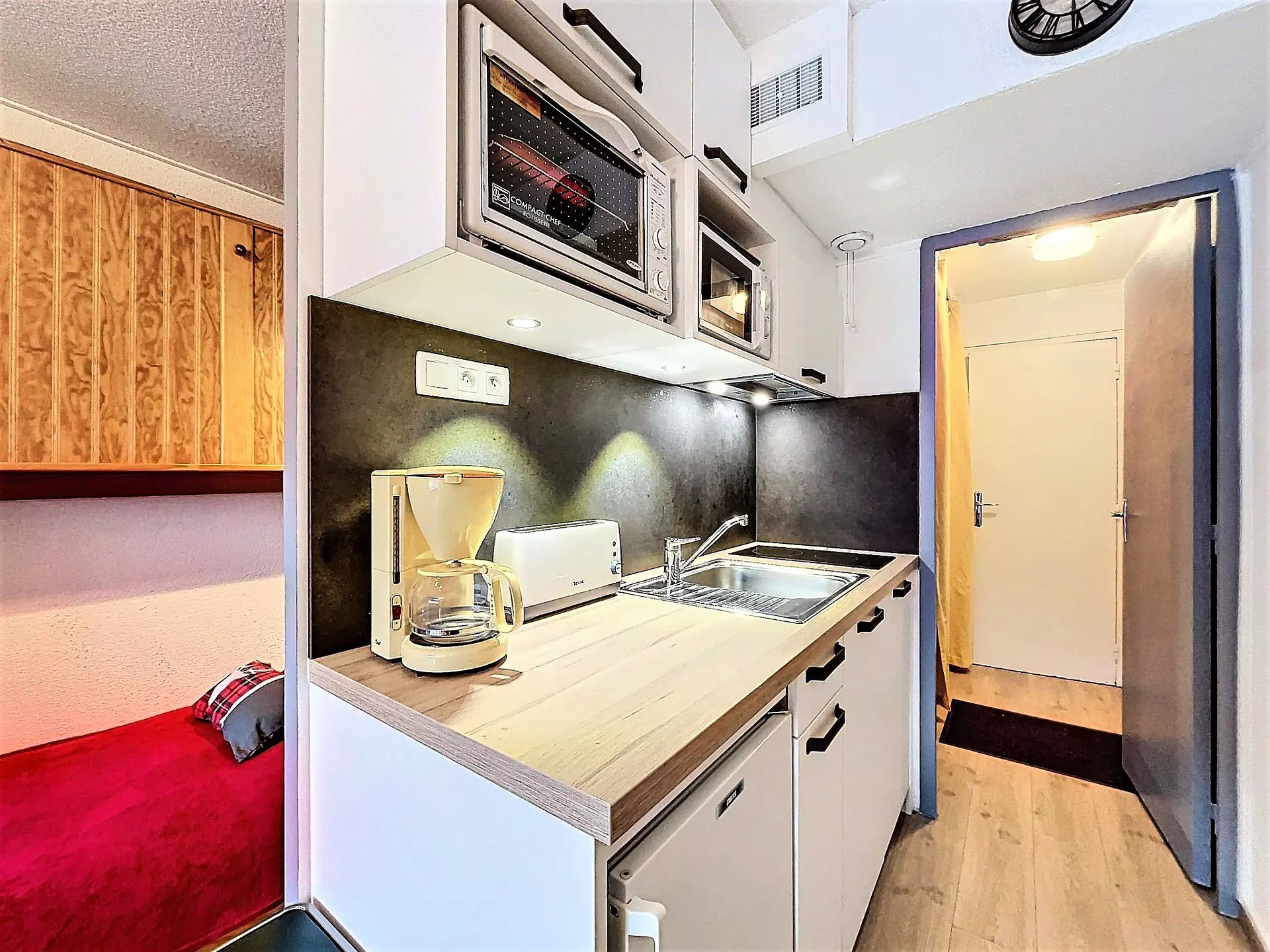 Studio comprenant une entrée avec placard de rangement, une salle de bain équipé d'un lave-linge d'un sèche-cheveux et de toilettes, un coin cuisine rénové équipé de 2 plaques vitro, d'un mini-four et d'un micro-onde, d'un lave vaisselle, d'un réfrigérateur top, d'un grille-pain et d'une cafetière filtre électrique. Appareil à raclette à disposition.