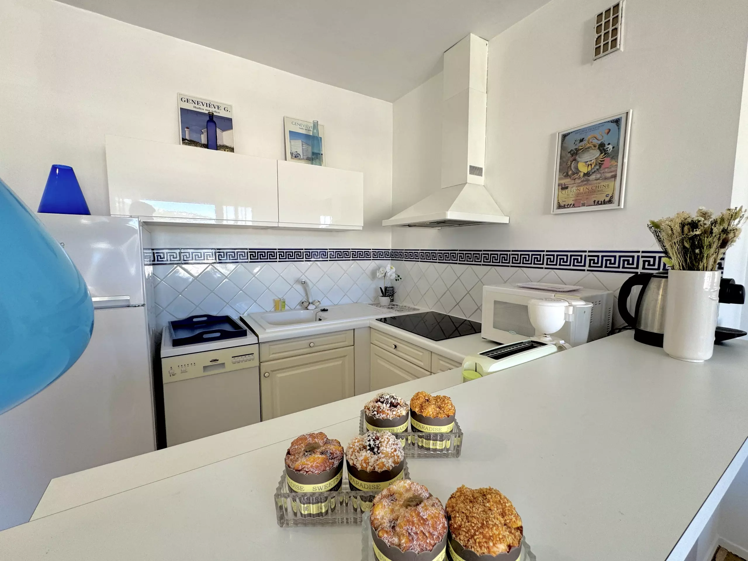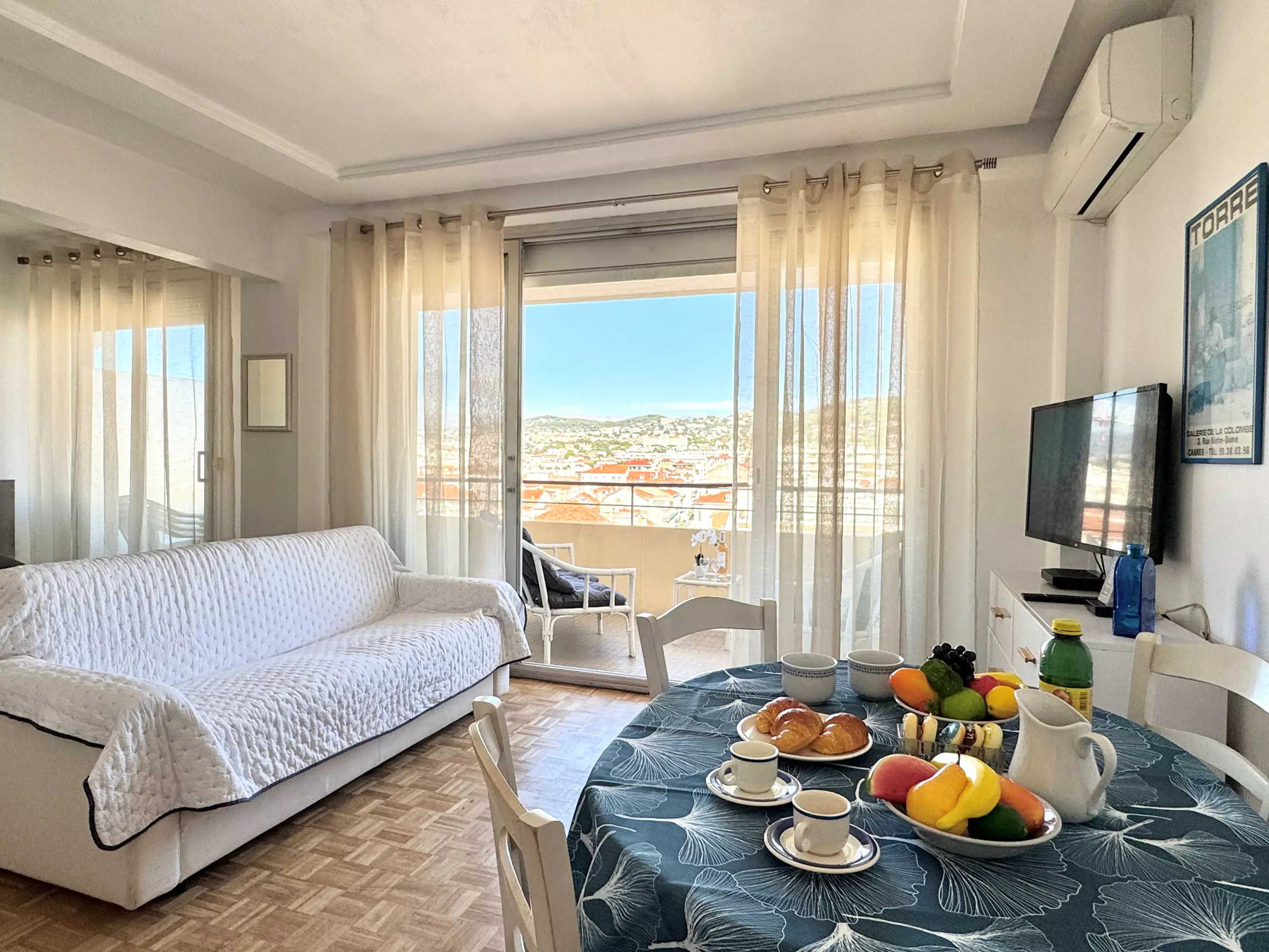 Le séjour se compose d'un lit double 160X200, d' un canapé convertible pour 2 personnes. Le tout ouvrant sur une belle grande terrasse avec vue sur les collines de Cannes.
