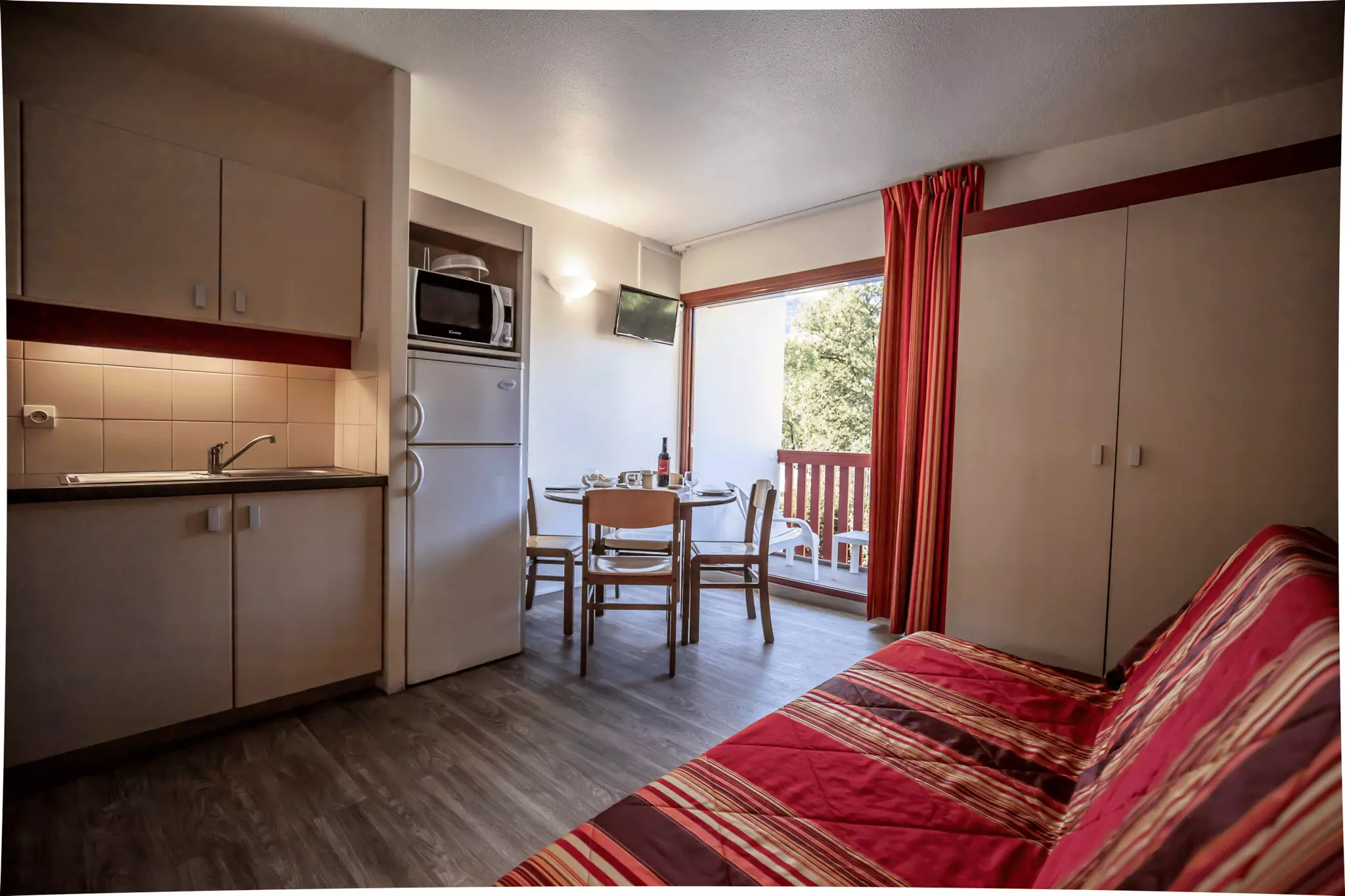 L'équipement comprend un mini-four et un réfrigérateur-congélateur.