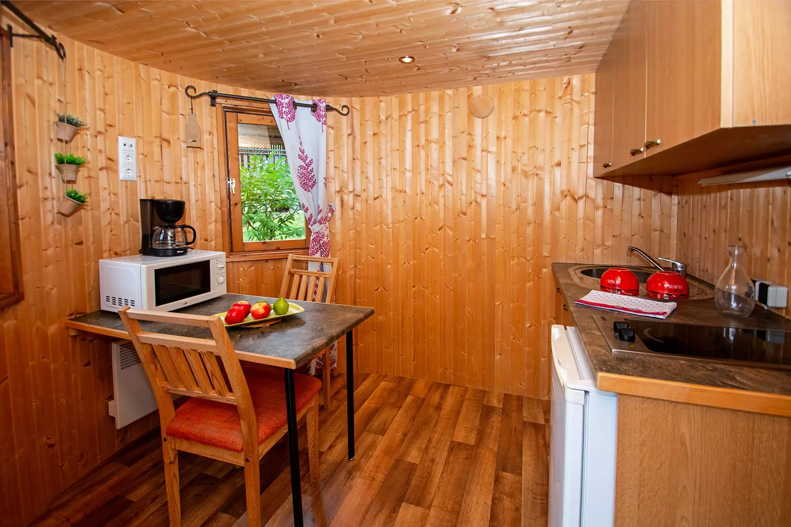 Tente lodge idéale pour retrouver les joies du camping avec un maximum de confort (coin cuisine équipée et literie).