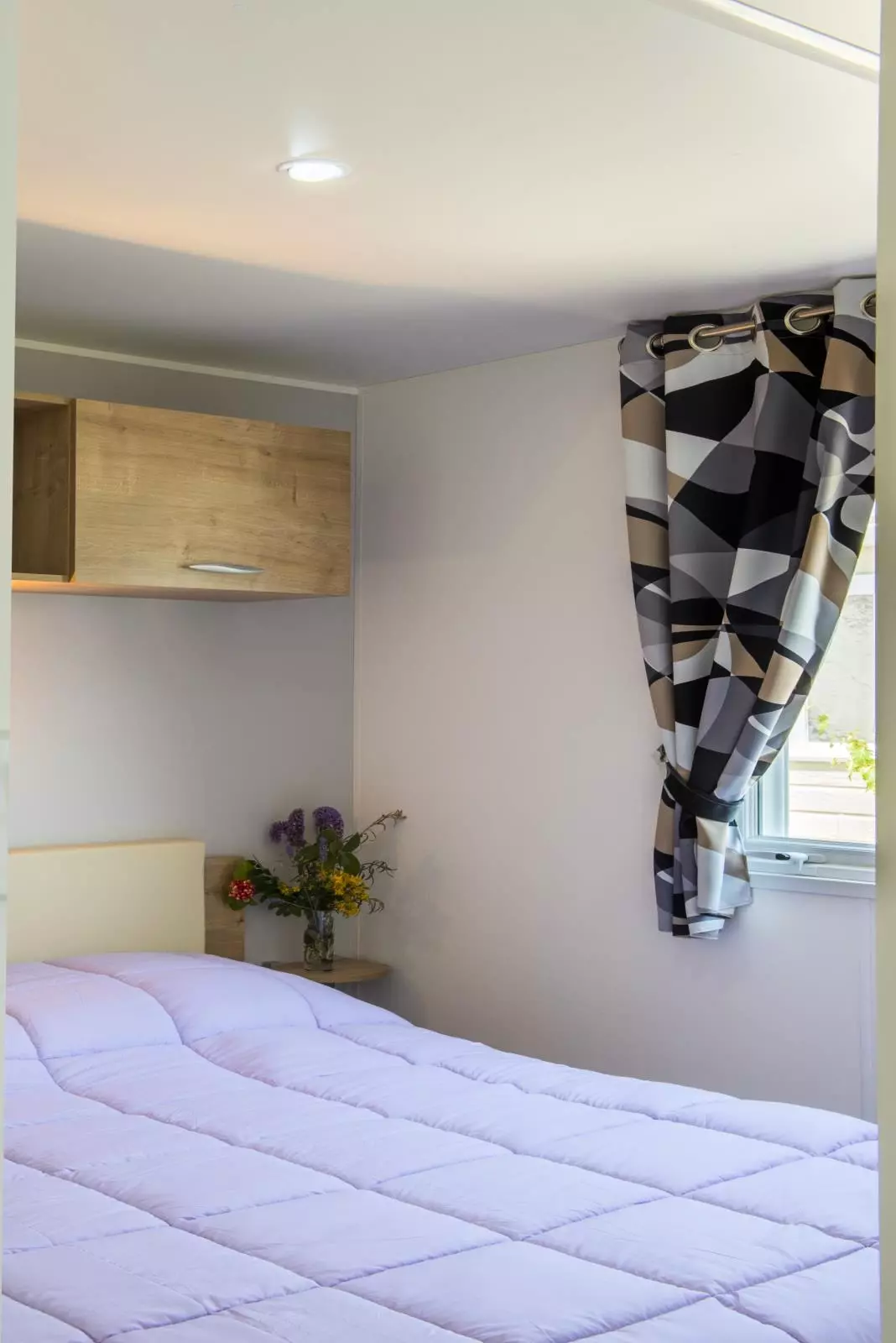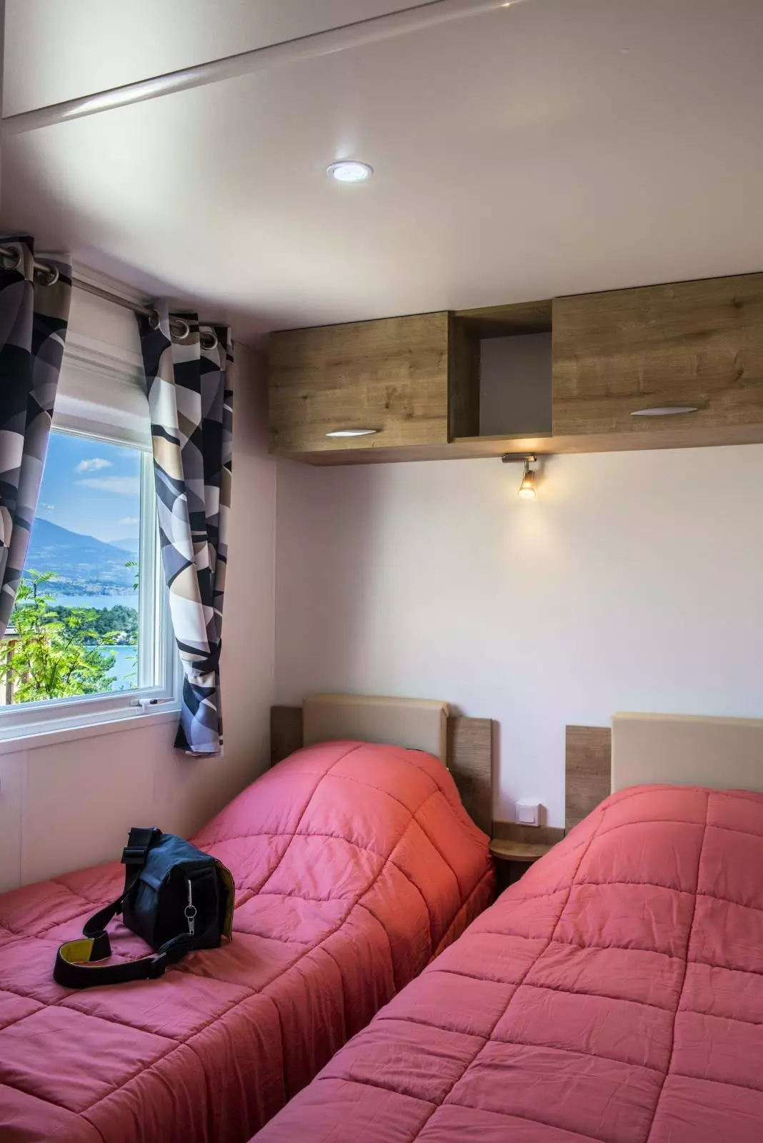 Les mobilhomes d'environ 36 m², agrémentés d'une belle terrasse, peuvent accueillir de 2 à 6 personnes. Confortablement installés sur votre terrasse, vous pourrez admirer la vue panoramique sur le lac de Serre Ponçon. Votre pavillon vous est proposé avec tout le confort intérieur : * séjour climatisé avec coin repas et coin salon avec TV, avec canapé convertible 2 places * cuisine avec réfrigérateur, plaques de cuisson, micro-ondes, lave-vaisselle et cafetière * salle de douche avec WC * 2 chambres à coucher : une avec 2 lits simples (80X190) et une avec 1 lit double (160x190) * d'une terrasse avec mobilier de jardin * d'un emplacement de voiture à proximité du logement