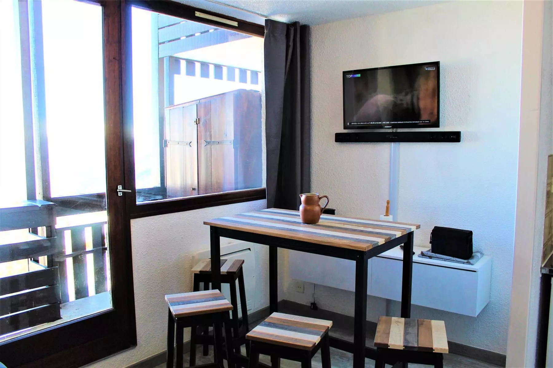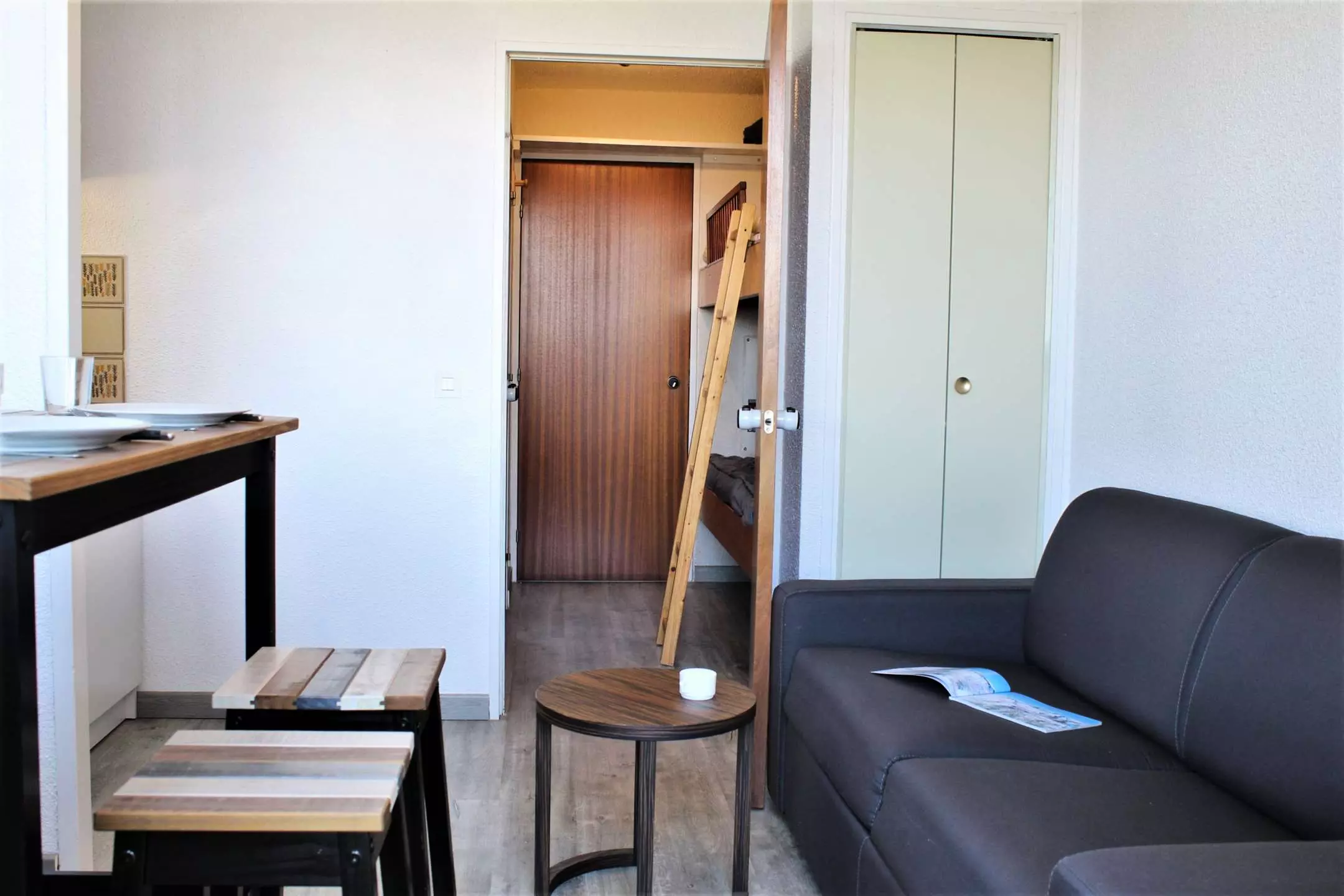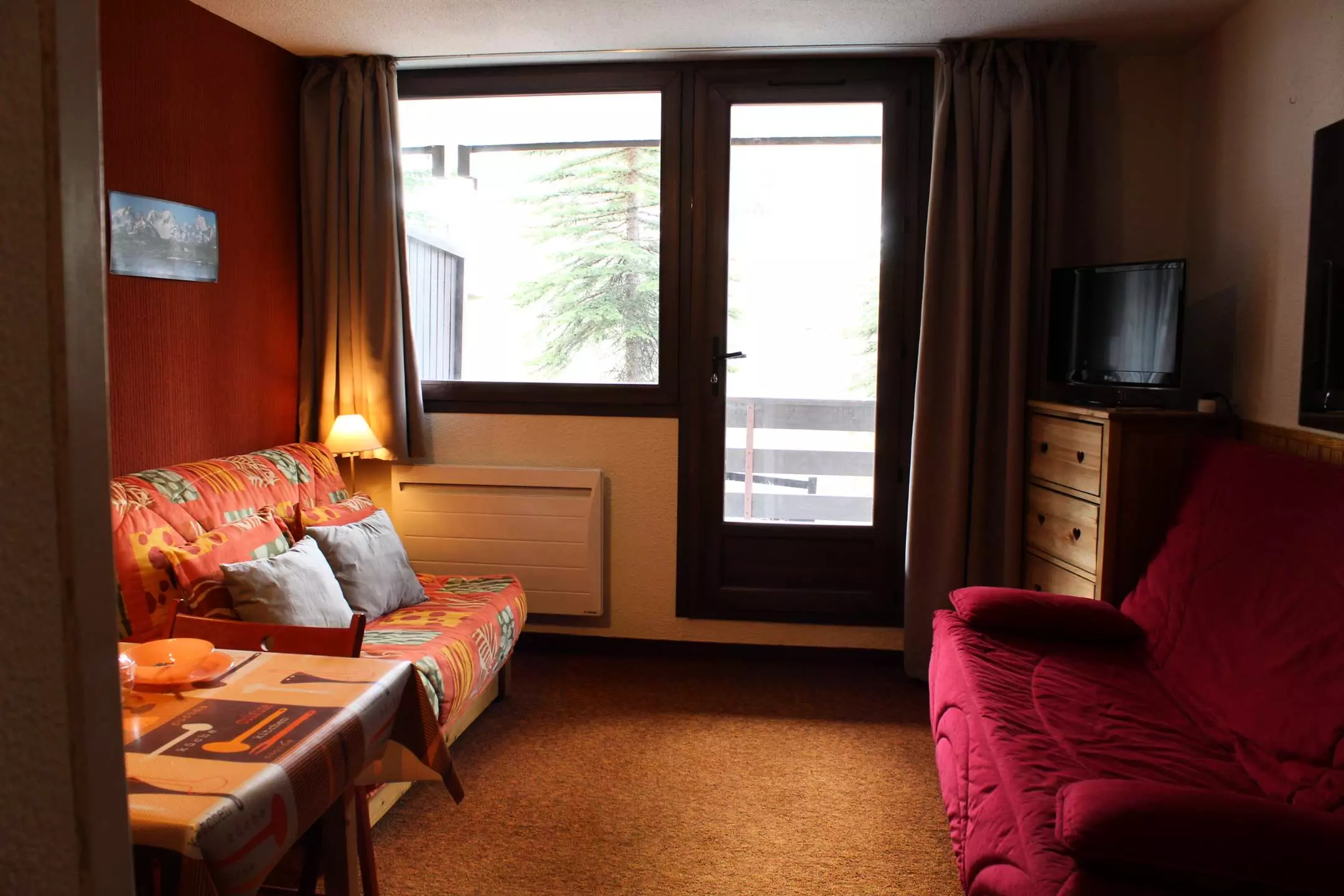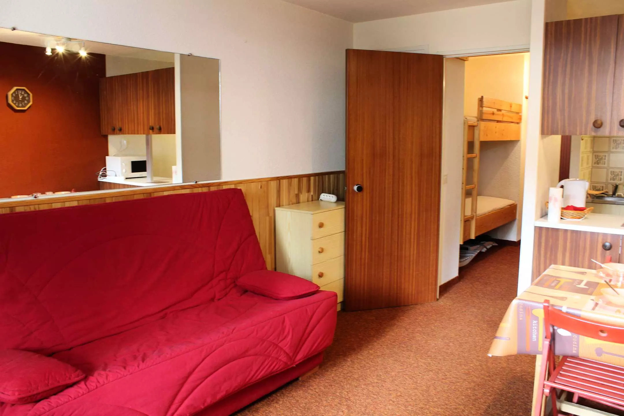Situé dans une résidence en pied de pistes, à quelques pas de la rue commerçante, l'appartement se compose d'une entrée avec un lit superposé (2 couchages simples) séparé de la pièce à vivre par une porte, puis dans le séjour d'un canapé convertible 2 personnes et d'une cuisine fonctionnelle. Il est aussi équipé d'une salle de bain avec baignoire, et de WC indépendants.